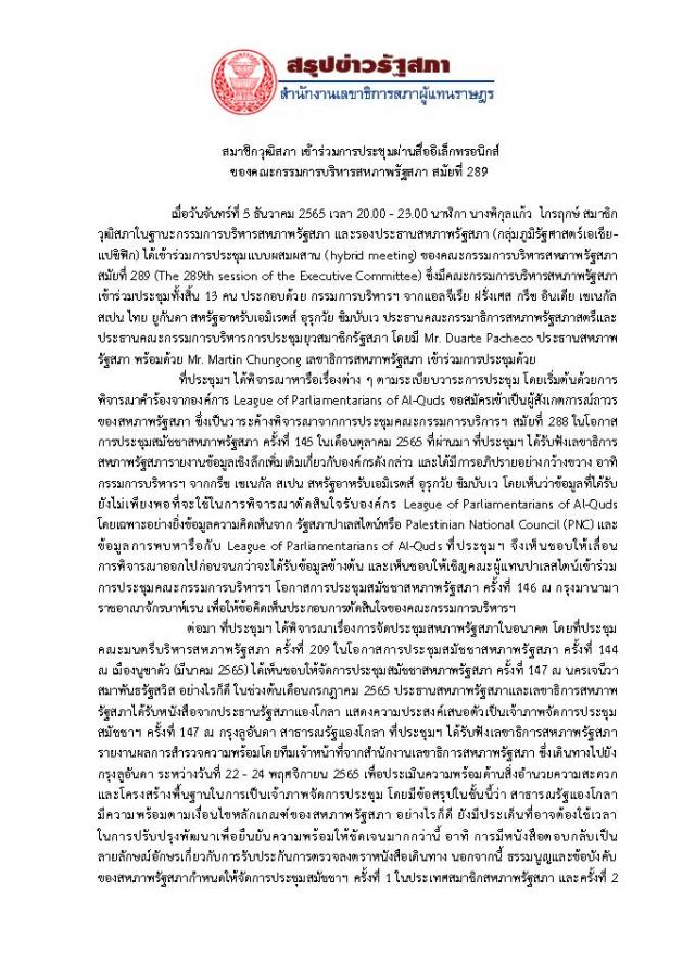 เมื่อวันที่ 5 ธันวาคม 2565 เวลา 20.00-23.00 นาฬิกา นางพิกุลแก้ว ไกรฤกษ์ สมาชิกวุฒิสภา ในฐานะกรรมการบริหารสหภาพรัฐสภา และรองประธานสหภาพรัฐสภา (กลุ่มภูมิรัฐศาสตร์เอเชีย-แปซิฟิก) ได้เข้าร่วมการประชุมแบบผสมผสาน (hybrid meeting) ของคณะกรรมการบริหารสหภาพรัฐสภา สมัยที่ 289 (The 289th session of the Executive Committee) ซึ่งมีคณะกรรมการบริหารสหภาพรัฐสภาเข้าร่วมประชุมทั้งสิ้น 13 คน ประกอบด้วย กรรมการบริหารฯ จากแอลจีเรีย ฝรั่งเศส กรีซ อินเดีย เซเนกัล สเปน ไทย ยูกันดา สหรัฐอาหรับเอมิเรตส์ อุรุกวัย ซิมบับเว ประธานคณะกรรมาธิการสหภาพรัฐสภาสตรีและประธานคณะกรรมการบริหารการประชุมยุวสมาชิกรัฐสภา โดยมี Mr. Duarte Pacheco ประธานสหภาพรัฐสภา พร้อมด้วย Mr. Martin Chungong เลขาธิการสหภาพรัฐสภา เข้าร่วมการประชุมด้วย