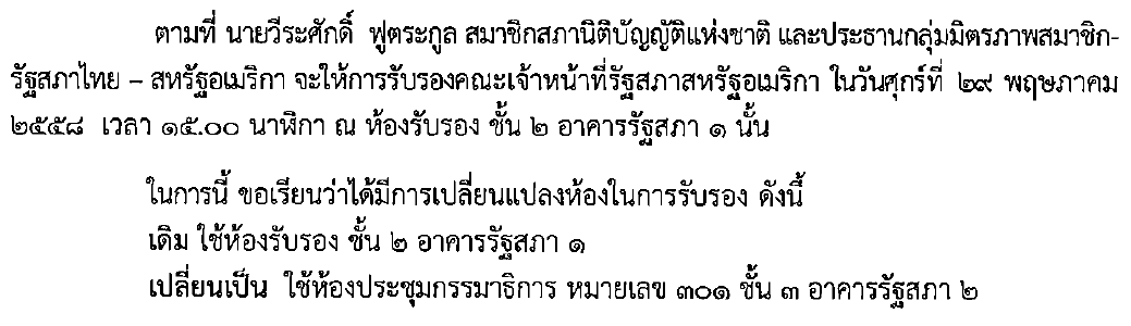 ขอเปลี่ยนแปลงห้องในการให้การรับรองคณะเจ้าหน้าที่รัฐสภาสหรัฐอเมริกา