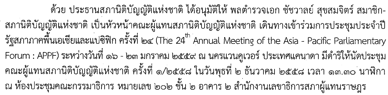 การประชุมคณะผู้แทนรัฐสภาไทยในการประชุมประจำปีรัฐสภาภาคพื้นเอเชียและแปซิฟิก (APPF) ครั้งที่ ๒๔ ครั้งที่ ๑/๒๕๕๘