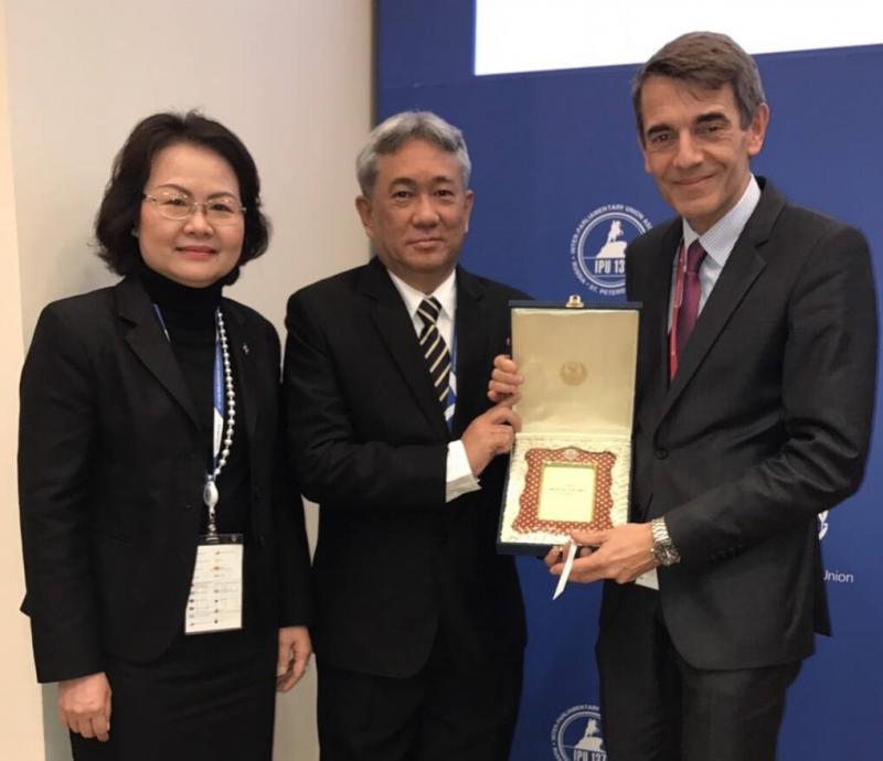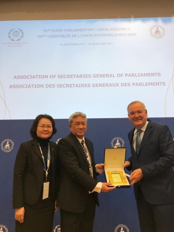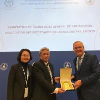เลขาธิการสภาผู้แทนราษฎรมอบของที่ระลึกให้แก่นาย Philippe Schwab ประธานสมาคมเลขาธิการรัฐสภาและเลขาธิการรัฐสภาสมาพันธรัฐสวิส |