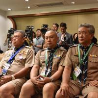 ประธานสภานิติบัญญัติแห่งชาติ พร้อมด้วย นายธำรง ทัศนาญชลี สมาชิกสภานิติบัญญัติแห่งชาติ และประธานกรรมการบริหาร ชมรมลูกเสือรัฐสภาไทย ร่วมกันแถลงข่าว