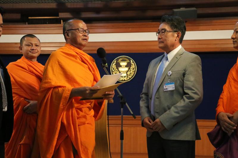 นายชาติชาย ณ เชียงใหม่ โฆษกกรรมการร่างรัฐธรรมนูญ รับยื่นหนังสือจาก พระมหาบุญถึง
