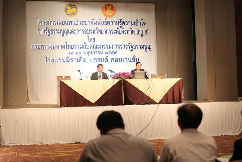 วันพุธที่ ๑๘ พฤษภาคม ๒๕๕๙ เวลา ๑๓.๐๐ นาฬิกา ณ โรงแรมมิราเคิล แกรนด์ คอนเวนชั่น กรุงเทพฯนายประพันธ์ นัยโกวิทและนายอัชพร จารุจินดา กรธ. ร่วมกันบรรยาย เรื่อง รัฐสภา คณะรัฐมนตรี กระบวนการเลือกตั้ง พรรคการเมือง และบทเฉพาะกาลในโครงการจัดการฝึกอบรมวิทยากรกระบวนการ (ครู ก) พร้อมบรรยายภาพรวมของร่างรัฐธรรมนูญ