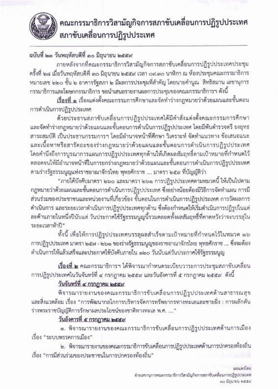 | วันพฤหัสบดีที่ ๓๐ มิถุนายน ๒๕๕๙ เวลา ๑๓.๐๐ นาฬิกา ณ บริเวณห้องโถง อาคารรัฐสภา ๑ นายคำนูณ สิทธิสมาน เลขานุการและโฆษกกรรมาธิการวิสามัญกิจการสภาขับเคลื่อนการปฏิรูปประเทศ แถลงข่าวถึงผลการประชุมวิป สปท. ดังนี้ เรื่องที่หนึ่ง เรื่องแต่งตั้งคณะกรรมการศึกษาและจัดทำร่างกฎหมายว่าด้วยแผนและขั้นตอนการดำเนินการปฏิรูปประเทศ และเรื่องที่สอง คณะกรรมาธิการฯ ได้พิจารณากำหนดระเบียบวาระการประชุมสภาขับเคลื่อนการปฏิรูปประเทศในวันจันทร์ที่ ๔ กรกฎาคม ๒๕๕๙ และวันอังคารที่ ๕ กรกฎาคม ๒๕๕๙ รายละเอียดตามเอกสารแนบ |