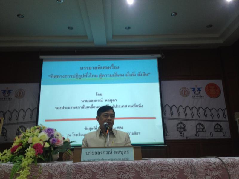 | รองประธานสปท.ชูแนวทางประชารัฐขับเคลื่อนการปฏิรูปจังหวัด ยก"โคราชโมเดล"ต้นแบบอีสาน วันศุกร์ที่ ๘ กรกฎาคม ๒๕๕๙ เวลา ๐๙.๓๐ นาฬิกา ณ หอประชุม ๙๐ ปี โรงเรียนราชสีมาวิทยาลัย จังหวัดนครราชสีมา นายอลงกรณ์ พลบุตร รองประธานสภาขับเคลื่อนการปฏิรูปประเทศ คนที่หนึ่ง นายไพฑูรย์ หลิมวัฒนา พลโท กมล สุวภาพ นายอัครินทร์ เลิศกิจชัยศิริ นายกษิดิ์เดชธนทัต เสกขุดทด นายกอบศักดิ์ ภูตระกูล สมาชิกสภาขับเคลื่อนการปฏิรูปประเทศ นายวิเชียร จันทรโณทัย ผู้ว่าราชการจังหวัดนครราชสีมา พร้อมด้วยรองนายกองค์การบริหารส่วนจังหวัดนครราชสีมา ร่วมกันแถลงข่าวเรื่อง "แนวทางการขับเคลื่อนงานปฏิรูปแบบประชารัฐเชิงพื้นที่โคราชโมเดล" โดยกล่าวว่าการปฏิรูปประเทศเป็นหน้าที่ของทุกคนโดยต้องเริ่มต้นปฏิรูปที่ตนเองก่อน เพื่อสร้างอนาคตใหม่ให้ประเทศ เราต้องรวมพลังสานความเข้าใจ เพื่อทำการปฏิรูปให้เกิดขึ้นอย่างต่อเนื่อง จังหวัดนครราชสีมาถือเป็นจุดเริ่มต้นจังหวัดแรกของภาคอีสานและเป็นต้นแบบการปฏิรูปเชิงพื้นที่ ที่นำการปฏิรูปตามแผนปฏิรูปสปท และยุทธศาสตร์ชาติมาเป็นแนวทางในการจัดทำแผนปฏิรูประดับจังหวัด ถือเป็นตัวอย่างของความร่วมมือกันจากทุกภาคส่วนที่ร่วมมือกันปฏิรูปตนเอง ภายใต้ยุทธศาสตร์ปฏิรูปทั่วไทย และแนวทางประชารัฐของรัฐบาล จากนั้นรองประธานสภาขับเคลื่อนการปฏิรูปประเทศ คนที่หนึ่ง บรรยายพิเศษเรื่อง "ทิศทางการขับเคลื่อนการปฏิรูปทั่วไทยภายใต้แนวทางประชารัฐ สู่ความมั่นคง มั่งคั่ง และยั่งยืน"ให้แก่ภาคีเครือข่ายความร่วมมือภาคส่วนต่างๆ ในจังหวัดนครราชสีมา อาทิ หัวหน้าส่วนราชการระดับจังหวัด องค์การบริหารส่วนจังหวัด ชมรมสันนิบาตเทศบาล สมาคมบริหารองค์การบริหารส่วนตำบล สมาคมกำนันผู้ใหญ่บ้าน สภาหอการค้าจังหวัด สภาอุตสาหกรรมจังหวัด อธิการบดีสถาบันอุดมศึกษา ผู้อำนวยการเขตพื้นที่การศึกษา เครือข่ายภาคประชาสังคม ผู้แทนสภาองค์กรชุมชน ในโครงการเวทีขับเคลื่อนการปฏิรูปผ่านพลังประชารัฐสู่โคราชทศวรรษหน้าจัดโดยอบจ.นครราชสีมาา จังหวัดนครราชสีมา สภาพัฒนาการเมืองด้วยความร่วมมือของสปท.โดยบรรยายถึงเหตุผลและความจำเป็นในการปฏิรูปประเทศ แผนการปฏิรูปประเทศทั้ง ๑๑ ด้าน เพื่อสื่อสารสร้างความเข้าใจเรื่องการปฏิรูปประเทศให้ทุกคนได้ตื่นรู้และเข้าใจ พร้อมทั้งยกตัวอย่างผลของการปฏิรูปในห้วงระยะเวลา ๒ ปีที่ผ่านมาโดยการนำของนายกรัฐมนตรีและแม่น้ำ ๕ สาย ทำให้ประเทศไทยแข็งแรงขึ้นได้รับการจัดอันดับที่ดีขึ้นในหลายๆ ด้านจากองค์การระหว่างป