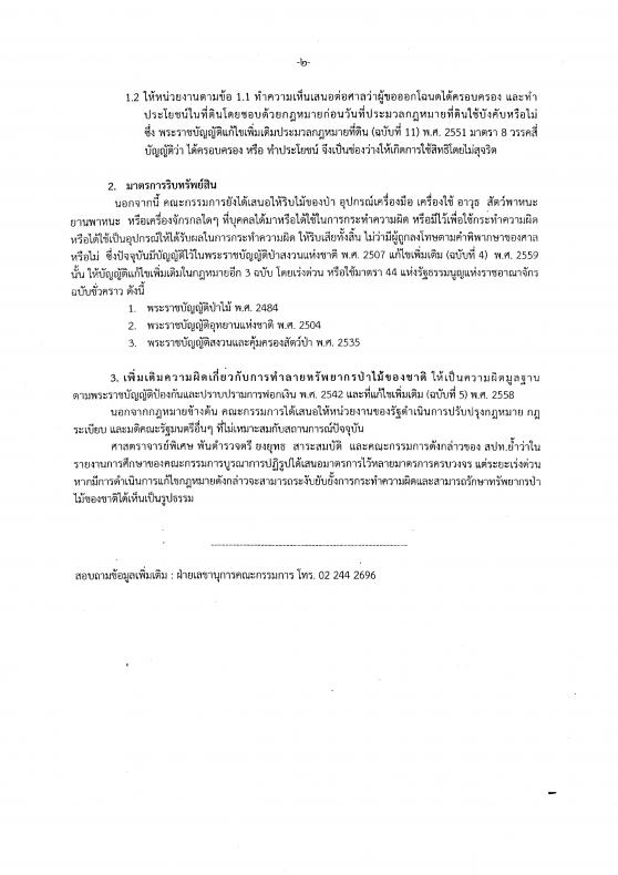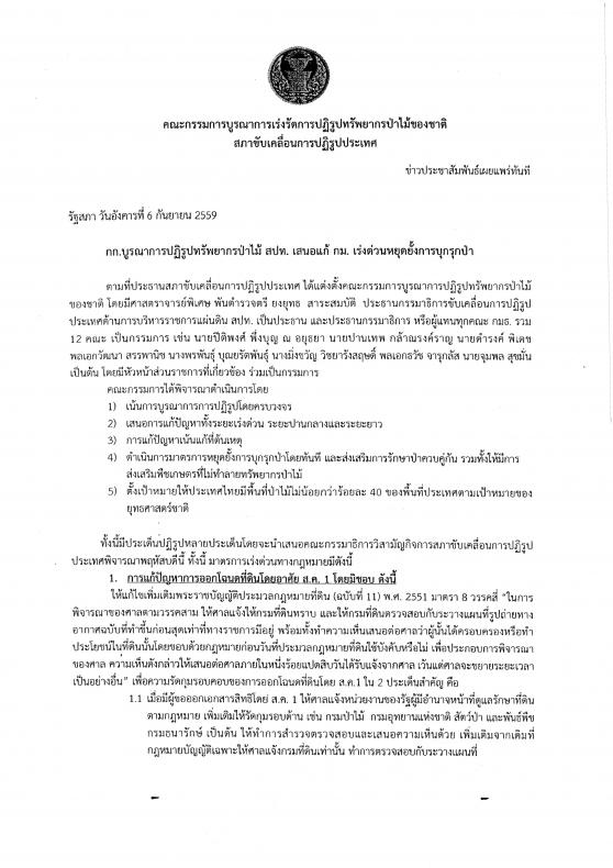 วันอังคารที่ ๖ กันยายน ๒๕๕๙ เวลา ๑๑.๕๐ นาฬิกา ณ บริเวณห้องโถง อาคารรัฐสภา ๑ ศาสตราจารย์พิเศษพันตำรวจตรี ยงยุทธ สาระสมบัติ ประธานคณะกรรมการบูรณาการเร่งรัดการปฏิรูปทรัพยากรป่าไม้ของชาติ และคณะกรรมการ ร่วมแถลงข่าว เรื่องเสนอแก้กฎหมายเร่งด่วนหยุดยั้งการบุกรุกป่า ซึ่งคณะกรรมการได้พิจารณาดำเนินการโดย เน้นการบูรณาการปฏิรูปโดยครบวงจร เสนอการแก้ปัญหาทั้งระยะเร่งด่วน ระยะปานกลางและระยะยาว การแก้ปัญหาเน้นแก้ที่ต้นเหตุ ดำเนินการมาตรการหยุดยั้งการบุกรุกป่าโดยทันที และส่งเสริมการรักษาป่าควบคู่กัน รวมทั้งให้มีการส่งเสริมพืชเกษตรที่ไม่ทำลายทรัพยากรป่าไม้ และได้ตั้งเป้าหมายให้ประเทศไทยมีพื้นที่ป่าไม้น้อยกว่าร้อยละ ๔๐ ของพื้นที่ประเทศตามเป้าหมายยุทธศาสตร์ชาติ