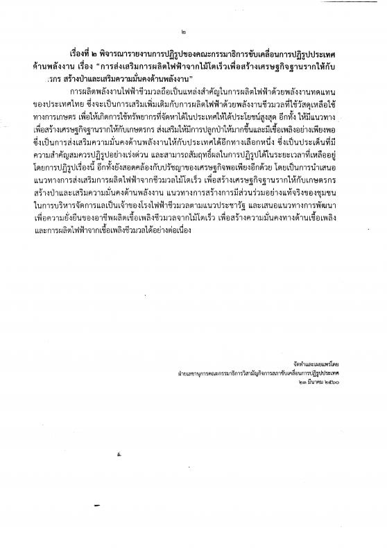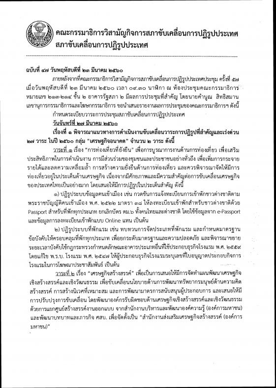 วันพฤหัสบดีที่ ๒๓ มีนาคม ๒๕๖๐ เวลา ๑๓.๐๐ นาฬิกา ณ บริเวณห้องโถง อาคารรัฐสภา ๑ นายคำนูณ สิทธิสมาน เลขานุการและโฆษกกรรมาธิการวิสามัญกิจการสภาขับเคลื่อนการปฏิรูปประเทศ แถลงข่าว ผลการประชุมคณะกรรมาธิการวิสามัญฯ โดยที่ประชุมได้กำหนดระเบียบวาระการประชุมสภาขับเคลื่อนการปฏิรูปประเทศในวันจันทร์ที่ ๒๗ มีนาคม ๒๕๖๐ ซึ่งจะพิจารณาแนวทางการดำเนินงานขับเคลื่อนวาระการปฏิรูปที่สำคัญและเร่งด่วน ๒๗ วาระ ในปี ๒๕๖๐ กลุ่ม เศรษฐกิจอนาคต จำนวน ๒ วาระ ได้แก่วาระที่ ๑ เรื่อง การท่องเที่ยวที่ยั่งยืน เพื่อการบูรณาการ งานด้านการท่องเที่ยว และเสริมประสิทธิภาพในการดำเนินงาน การมีส่วนร่วมของชุมชนและประชาชนอย่างทั่วถึง โดยจะเสนอให้มีการปฏิรูประบบข้อมูลคนเข้าเมือง และปฏิรูประบบที่พักแรมวาระที่ ๒ เรื่อง เศรษฐกิจสร้างสรรค์ เพื่อเป็นการเสนอให้มีการจัดทำแผนพัฒนาเศรษฐกิจเชิงสร้างสรรค์และเชิงวัฒนธรรม เพื่อขับเคลื่อนนโยบายด้านการพัฒนาทรัพยากรมนุษย์ด้านความคิดสร้างสรรค์ การสร้างนิเวศที่เหมาะสม และการพัฒนามาตรการสนับสนุนผู้ประกอบการนอกจากนี้จะพิจารณาเรื่องที่เสนอใหม่ คือ รายงานการปฏิรูปของคณะกรรมาธิการขับเคลื่อนการปฏิรูปประเทศด้านพลังงานเรื่อง การส่งเสริมการผลิตไฟฟ้าจากไม้โตเร็วเพื่อสร้างเศรษฐกิจฐานรากให้กับเกษตรกร สร้างป่า และเสริมความมั่นคงด้านพลังงาน |