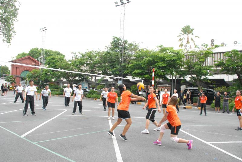 กำลังกายประกอบเพลงกราวกีฬาด้วย และในเวลา ๑๖.๓๐ นาฬิกา มีการแข่งขันกีฬาวอลเลย์บอลระหว่าง ทีมสมาชิก