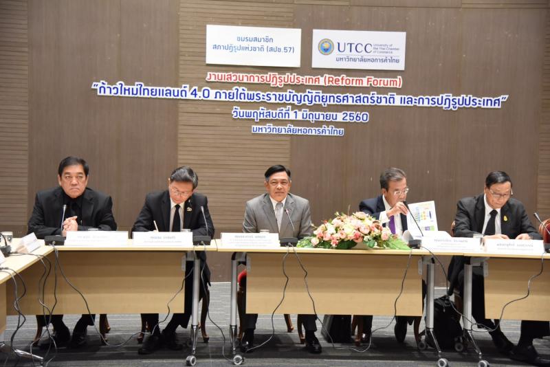 ทั้งนี้งานเสวนาดังกล่าวจัดโดยชมรมสมาชิกสภาปฏิรูปแห่งชาติ ๕๗ (สปช. ๕๗) ร่วมกับมหาวิทยาลัยหอการค้าไทย โดยมีผู้ร่วมเสวนา ได้แก่ นายเกริกไกร จีระแพทย์ อดีตสมาชิกสภาปฏิรูปแห่งชาติ/อดีตรัฐมนตรีว่าการกระทรวงพาณิชย์ และอดีตเอกอัครราชทูตผู้แทนถาวรไทย ประจำองค์การโลก พล.อ.ชูศักดิ์ เมฆสุวรรณ์สมาชิกสภาขับเคลื่อนการปฎิรูปประเทศ ดร.พจน์ อร่ามวัฒนานนท์ รองประธานกรรมการสภาหอการค้าแห่งประเทศไทย/ประธานกลุ่มธุรกิจเกษตรและอาหารหอการค้าไทย นายเจน นำชัยศิริ ประธานสภาอุตสาหกรรมแห่งประเทศไทย ศ.ดร.ตีรณ พงศ์มฆพัฒน์ คณบดีคณะเศรษฐศาสตร์ จุฬาลงกรณ์มหาวิทยาลัย ดร.สุทัศน์ เศรษฐบุญสร้าง ประธานกรรมการบริหาร บริษัทหลักทรัพย์จัดการกองทุน เอ็มเอฟซี จำกัด (มหาชน) และคุณพจนีย์ ธนวรานิช กรรมการอิสระ/ประธานกรรมการตรวจสอบ ธนาคารกรุงศรีอยุธยา ดำเนินรายการโดย นายบุญเลิศ คชายุทธเดช และนายนิมิตร สิทธิไตรย์ อดีตสมาชิกสภาปฏิรูปแห่งชาติ. |
