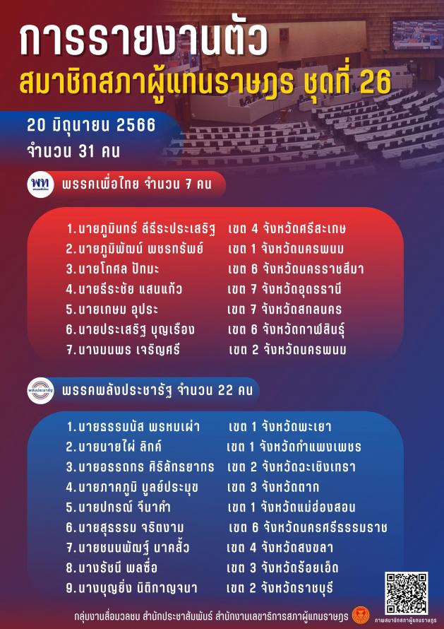 สรุปภาพรวมการรายงานตัวสมาชิกสภาผู้แทนราษฎร ชุดที่ 26 วันแรก ตั้งแต่เวลา 08.30 16.30 นาฬิกา มี ส.ส. มารายงานตัว จำนวนทั้งหมด 31 คน