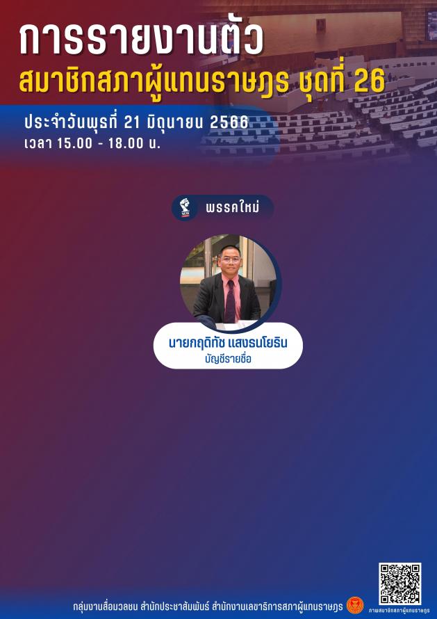 วันพุธที่ 21 มิถุนายน 2566 ณ ชั้น B1 อาคารรัฐสภา ซึ่งเป็นวันที่สองของการรับรายงานตัวสมาชิกสภาผู้แทนราษฎร ชุดที่ 26 ระหว่างเวลา 15.00 18.00 นาฬิกา มีสมาชิกสภาผู้แทนราษฎรมารายงานตัวจำนวน 1 คน คือ นายกฤดิทัช แสงธนโยธิน สมาชิกสภาผู้แทนราษฎร แบบบัญชีรายชื่อ พรรคใหม่
