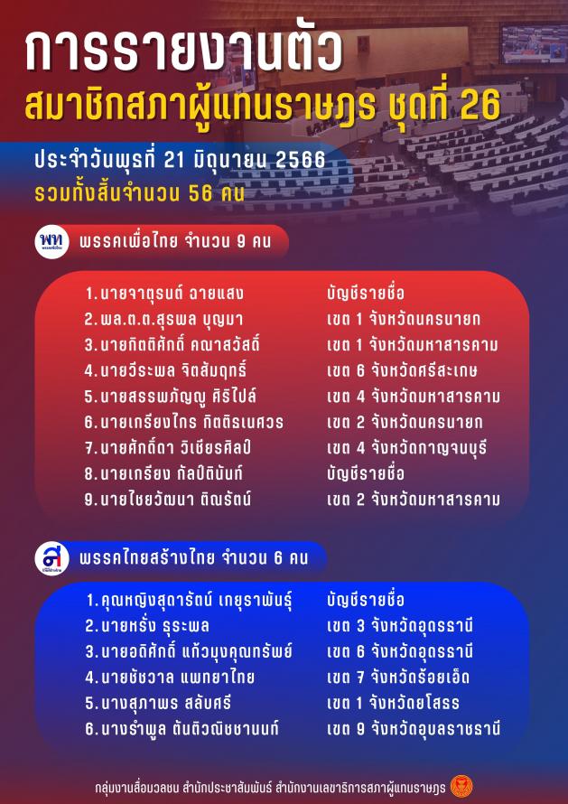 โดยในวันนี้ ตั้งแต่เวลา 08.30 18.00 นาฬิกา มีสมาชิกสภาผู้แทนราษฎรมารายงานตัว จำนวนทั้งสิ้น 56 คน ทั้งนี้ ตั้งแต่วันที่ 20 21 มิ.ย. 66 ได้มีสมาชิกสภาผู้แทนราษฎรมารายงานตัวต่อสำนักงานเลขาธิการสภาผู้แทนราษฎรแล้วจำนวนทั้งสิ้น 87 คน