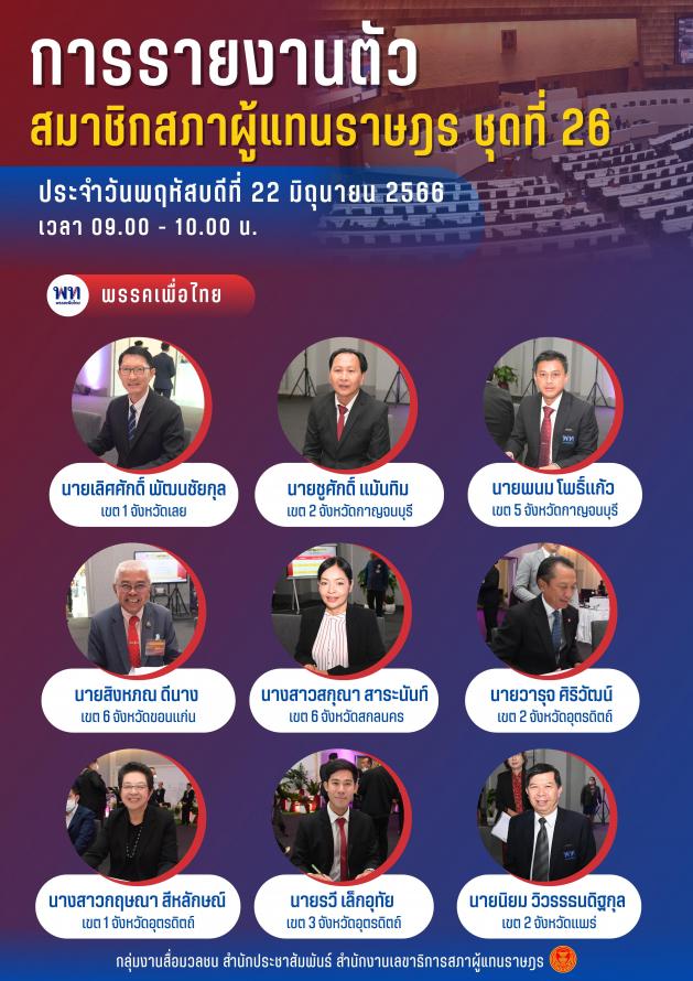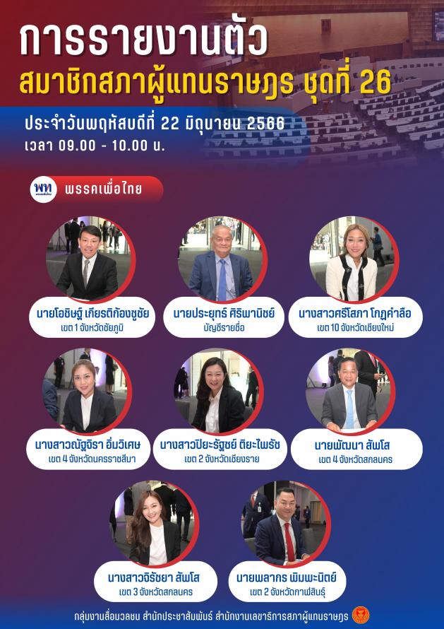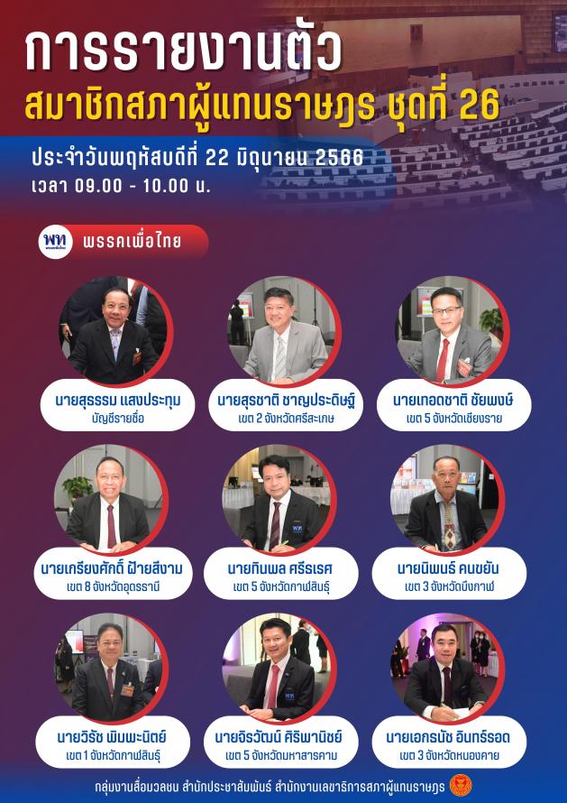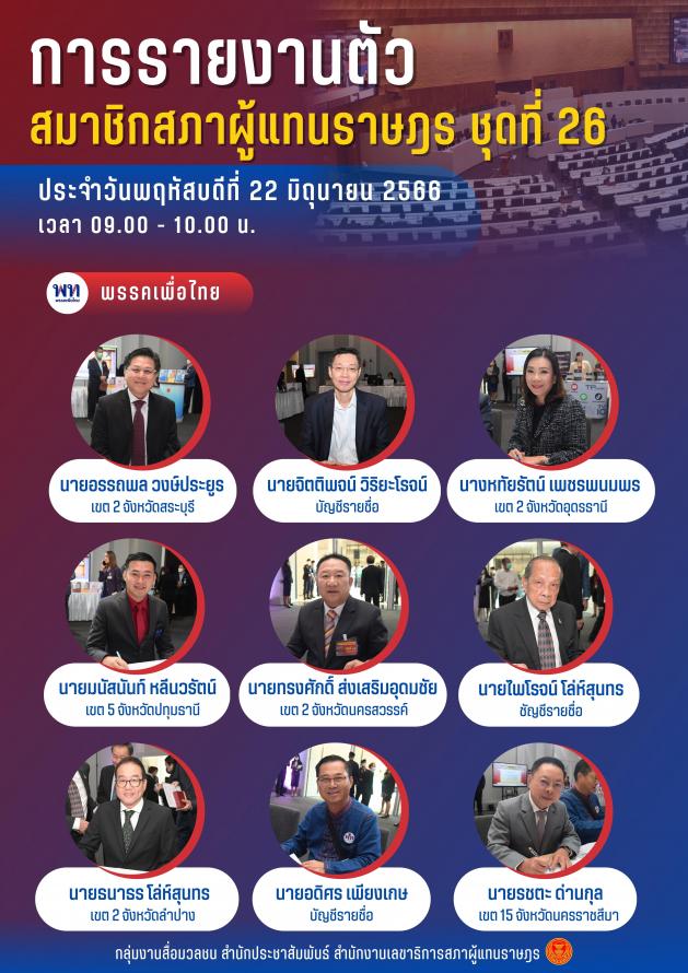 วันพฤหัสบดีที่ที่ 22 มิถุนายน 2566 ซึ่งเป็นวันที่สามของการรายงานตัวสมาชิกสภาผู้แทนราษฎร ชุดที่ 26 ระหว่างเวลา 09.00 - 10.00 นาฬิกา ณ ชั้น B1 อาคารรัฐสภา มีสมาชิกสภาผู้แทนราษฎรมารายงานตัวจำนวน 45 คน คือ