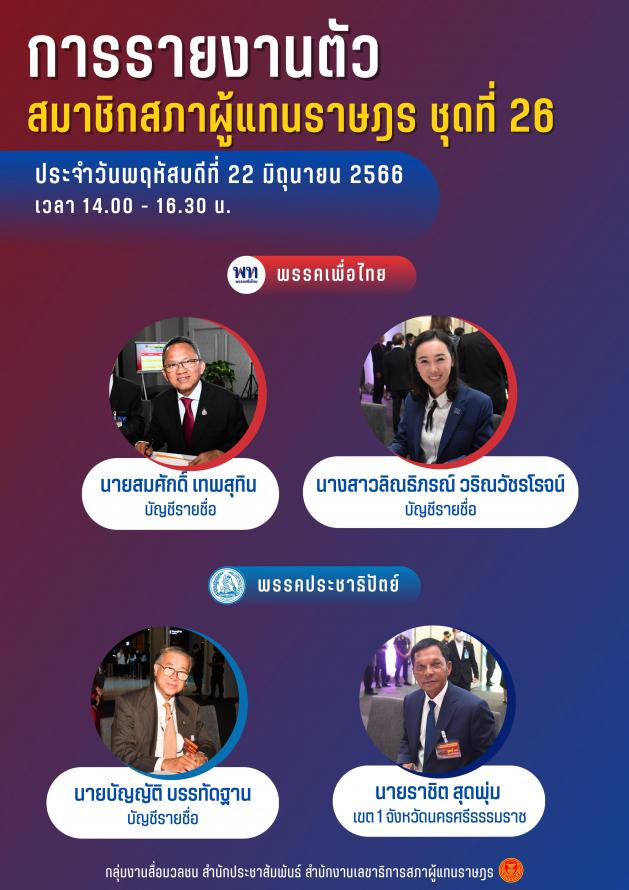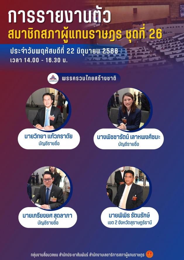 วันพฤหัสบดีที่ 22 มิถุนายน 2566 ซึ่งเป็นวันที่สามของการรับรายงานตัวสมาชิกสภาผู้แทนราษฎร ชุดที่ 26 ระหว่างเวลา 14.00 16.30 นาฬิกา มีสมาชิกสภาผู้แทนราษฎรมารายงานตัว จำนวน 8 คน คือ
