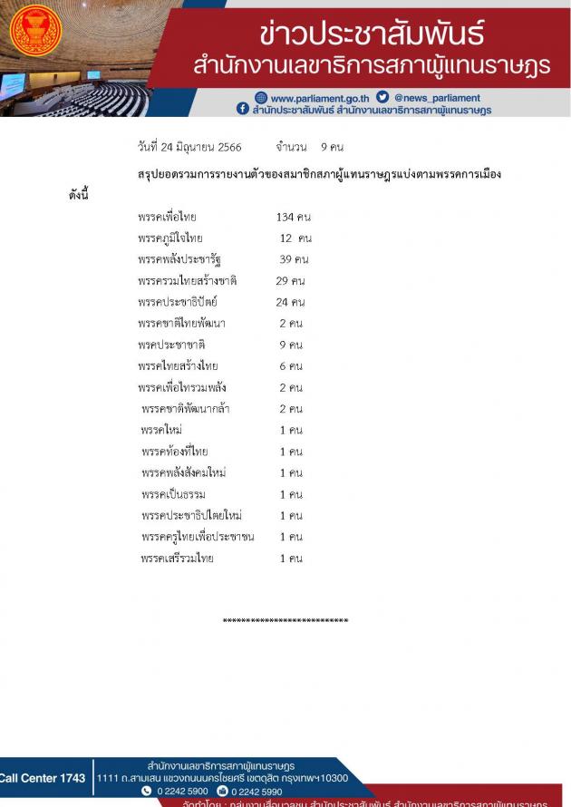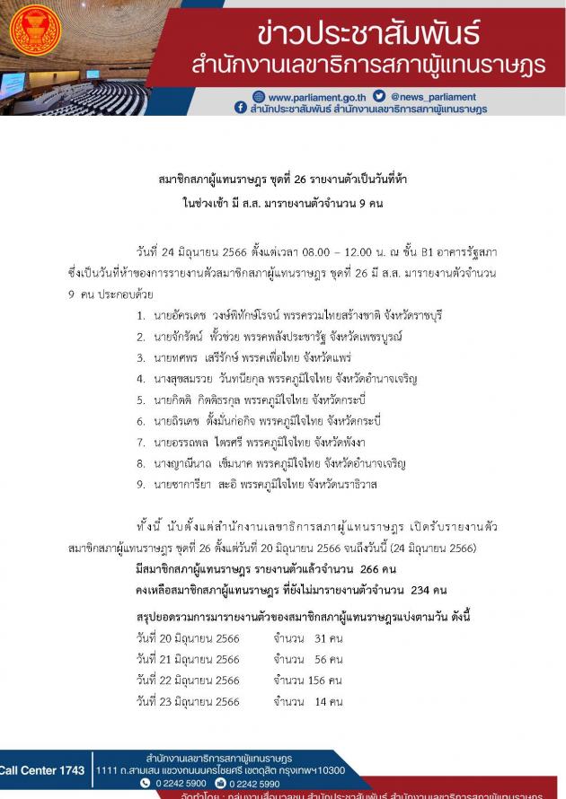 ในช่วงเช้า (24 มิ.ย. 66) มีสมาชิกสภาผู้แทนราษฎรมารายงานตัว จำนวน 9 คน