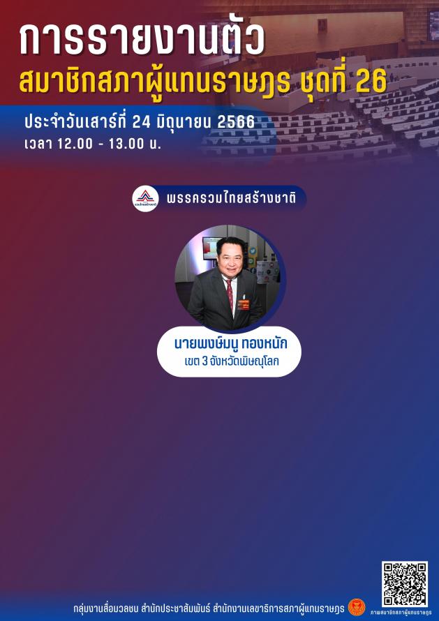 วันเสาร์ที่ 24 มิถุนายน 2566 เวลา 12.00 - 13.00 นาฬิกา ซึ่งเป็นวันที่ห้าของการรายงานตัว ส.ส. ชุดที่ 26 มี ส.ส. มารายงานตัวจำนวน 1 คน คือ นายพงษ์มนู ทองหนัก พรรครวมไทยสร้างชาติ จังหวัดพิษณุโลก