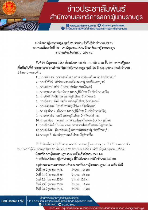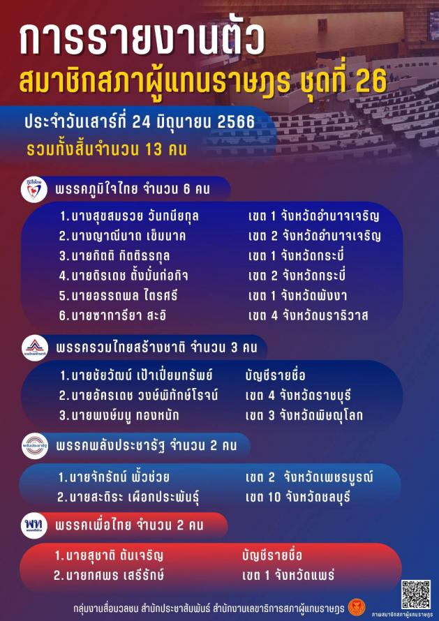 วันเสาร์ที่ 24 มิถุนายน 2566 ตั้งแต่เวลา 08.30 17.00 นาฬิกา ซึ่งเป็นวันที่ห้าของการรายงานตัว ส.ส. ชุดที่ 26 มี ส.ส. มารายงานตัว จำนวน 13 คน