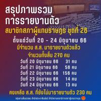 สรุปภาพรวมการรายงานตัวตั้งแต่วันที่ 20 -24 มิถุนายน 2566 มี ส.ส. มารายงานตัว จำนวนรวม 270 คนคงเหลือจำนวน 230 คน (วันที่ 20 มิ.ย. 66 จำนวน 31 คน วันที่ 21 มิ.ย. 66 จำนวน 56 คน วันที่ 22 มิ.ย. 66 จำนวน 156 คน วันที่ 23 มิ.ย. 66 จำนวน 14 คน และ วันที่ 24 มิ.ย. 66 จำนวน 13 คน)