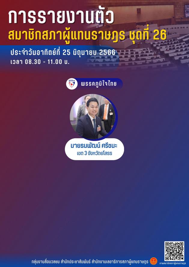วันอาทิตย์ที่ 25 มิถุนายน 2566 เวลา 08.30 11.00 นาฬิกา ซึ่งเป็นวันที่หกของการรายงานตัว ส.ส. ชุดที่ 26 มี ส.ส. มารายงานตัว จำนวน 1 คน คือ นายธนพัฒน์ ศรีชนะ พรรคภูมิใจไทย จังหวัดยโสธร