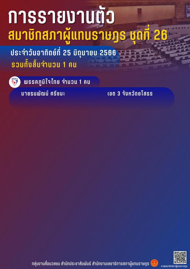 วันอาทิตย์ที่ 25 มิถุนายน 2566 ตั้งแต่เวลา 08.30 16.30 นาฬิกา ซึ่งเป็นวันที่หกของการรายงานตัว สมาชิกสภาผู้แทนราษฎร ชุดที่ 26 มีสมาชิกสภาผู้แทนราษฎรมารายงานตัว จำนวน 1 คน