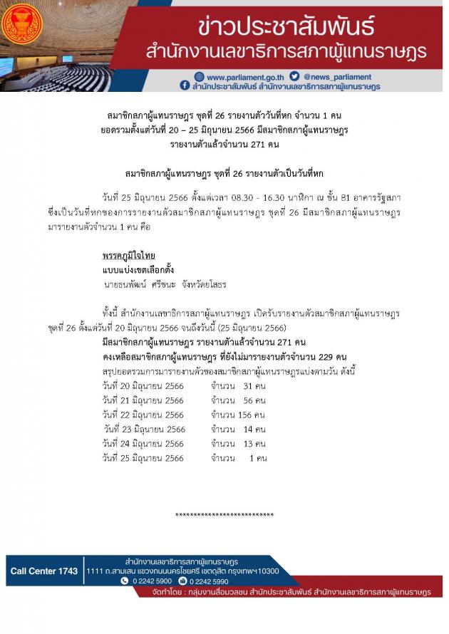 สรุปภาพรวมการรายงานตัวสมาชิกสภาผู้แทนราษฎร ตั้งแต่วันที่ 20 -25 มิถุนายน 2566 มีสมาชิกสภาผู้แทนราษฎรมารายงานตัว จำนวนรวม 271 คน คงเหลือจำนวน 229 คน (วันที่ 20 มิ.ย. 66 จำนวน 31 คน วันที่ 21 มิ.ย. 66 จำนวน 56 คน วันที่ 22 มิ.ย. 66 จำนวน 156 คน วันที่ 23 มิ.ย. 66 จำนวน 14 คน วันที่ 24 มิ.ย. 66 จำนวน 13 คน และวันที่ 25 มิ.ย. 66 จำนวน 1 คน)
