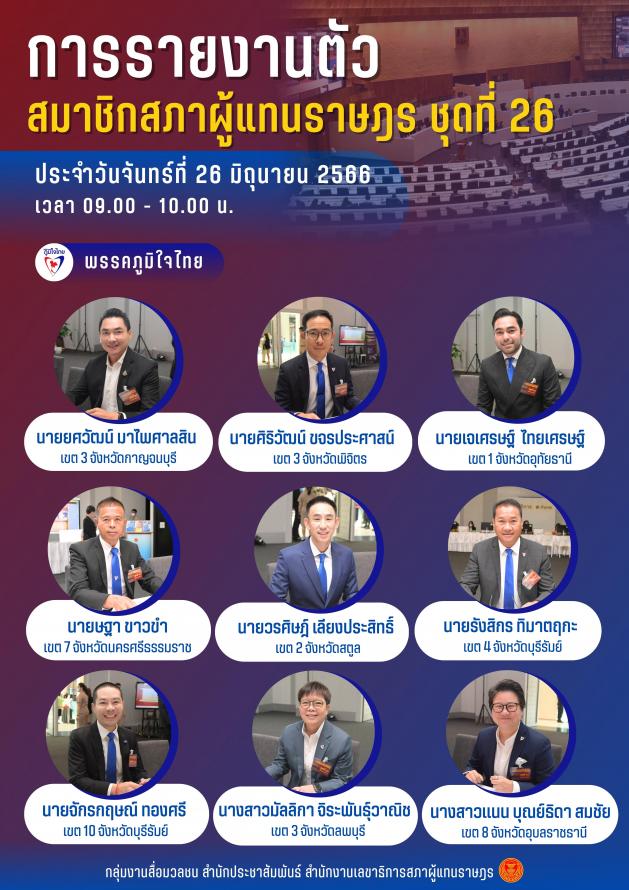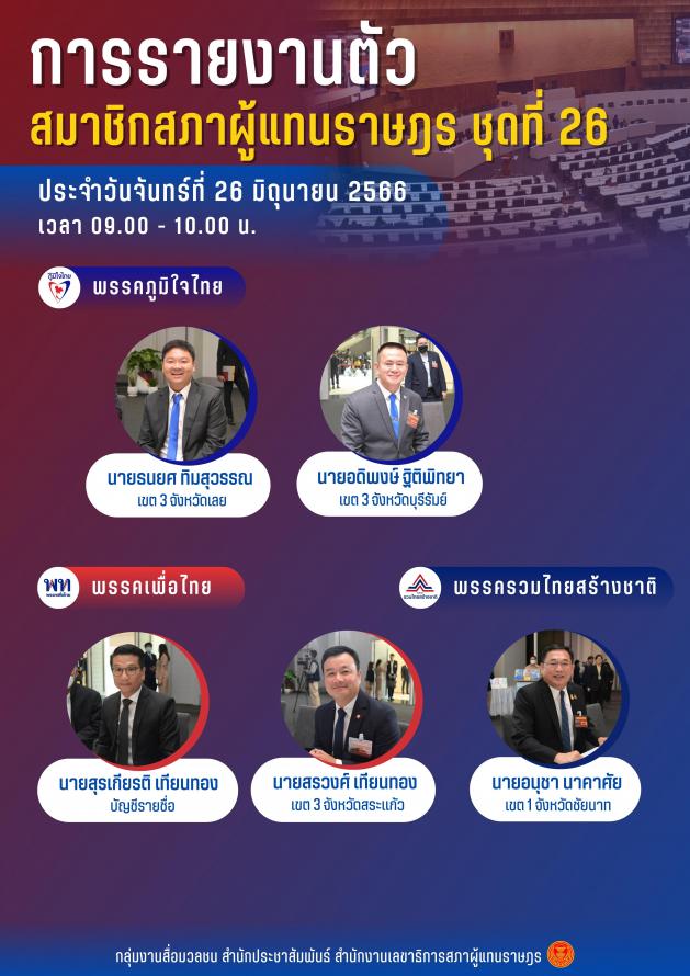 วันจันทร์ที่ 26 มิถุนายน 2566 เวลา 09.00 10.00 นาฬิกา ซึ่งเป็นวันที่เจ็ดของการรายงานตัว สมาชิกสภาผู้แทนราษฎร ชุดที่ 26 มีสมาชิกสภาผู้แทนราษฎรมารายงานตัวจำนวน 14 คน ประกอบด้วย