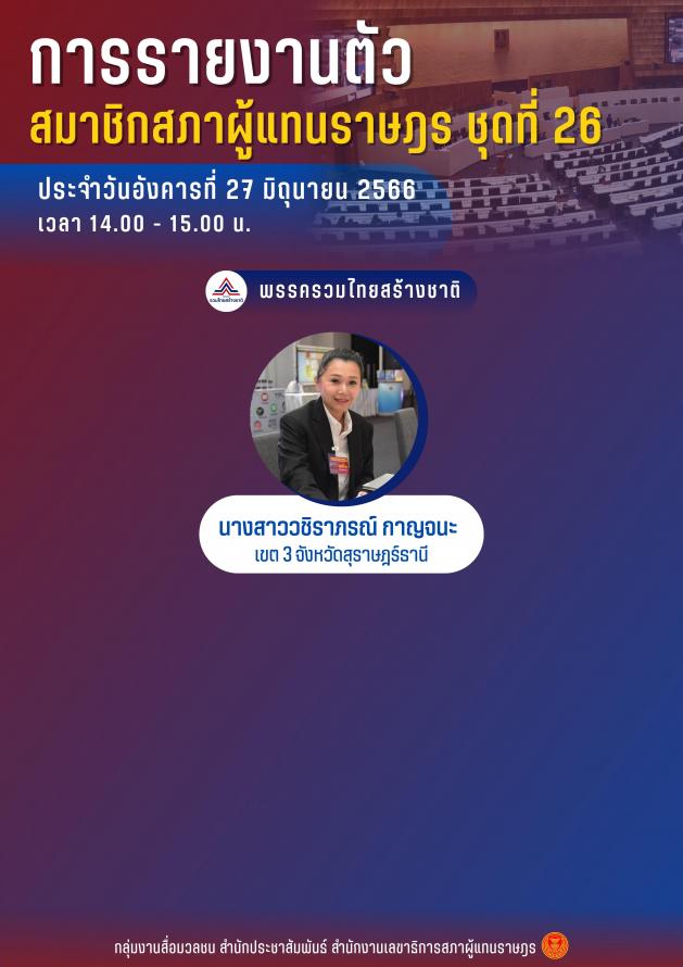 วันอังคารที่ 27 มิถุนายน 2566 เวลา 14.00 15.00 นาฬิกา ซึ่งเป็นวันที่แปดของการรายงานตัว ส.ส.ชุดที่ 26 มี ส.ส. มารายงานตัวจำนวน 1 คน คือ น.ส.วชิราภรณ์ กาญจนะ พรรครวมไทยสร้างชาติ จังหวัดสุราษฎร์ธานี