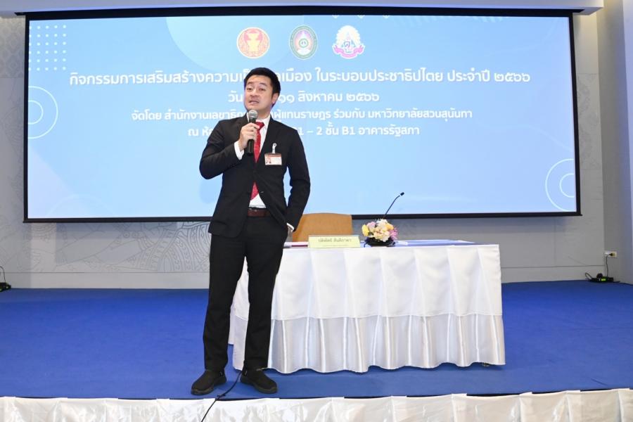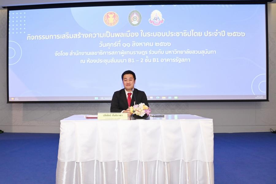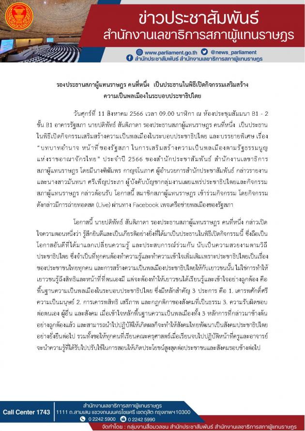 วันศุกร์ที่ 11 สิงหาคม 2566 เวลา 09.00 นาฬิกา ณ ห้องประชุมสัมมนา B1 - 2  ชั้น B1 อาคารรัฐสภา นายปดิพัทธ์ สันติภาดา รองประธานสภาผู้แทนราษฎร คนที่หนึ่ง  เป็นประธานในพิธีเปิดกิจกรรมเสริมสร้างความเป็นพลเมืองในระบอบประชาธิปไตย และบรรยายพิเศษ เรื่อง “บทบาทอำนาจ หน้าที่ของรัฐสภา ในการเสริมสร้างความเป็นพลเมืองตามรัฐธรรมนูญแห่งราชอาณาจักรไทย”ประจำปี 2566 ของสำนักประชาสัมพันธ์ สำนักงานเลขาธิการสภาผู้แทนราษฎร โดยมีนางฑิฆัมพร กาญจโนภาศ ผู้อำนวยการสำนักประชาสัมพันธ์ กล่าวรายงาน  และนางสาวมันทนา ศรีเพ็ญประภา ผู้บังคับบัญชากลุ่มงานเผยแพร่ประชาธิปไตยและกิจกรรมสภาผู้แทนราษฎร กล่าวต้อนรับ