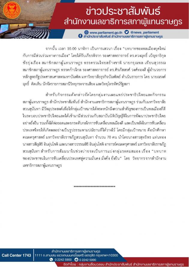 รองประธานสภาผู้แทนราษฎร คนที่หนึ่ง เป็นประธานในพิธีเปิดกิจกรรมเสริมสร้างความเป็นพลเมืองในระบอบประชาธิปไตย และบรรยายพิเศษ เรื่อง “บทบาทอำนาจ หน้าที่ของรัฐสภา ในการเสริมสร้างความเป็นพลเมืองตามรัฐธรรมนูญแห่งราชอาณาจักรไทย”