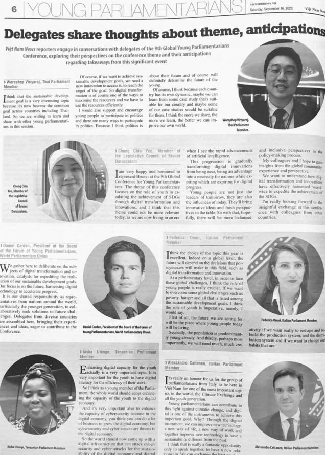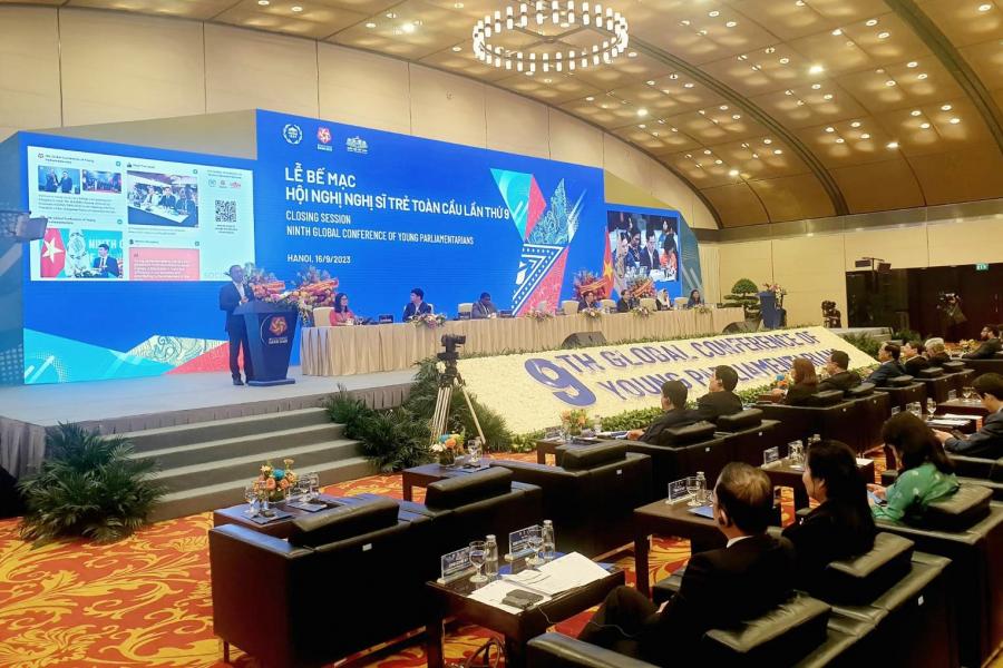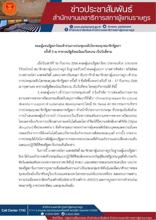 เมื่อวันเสาร์ที่ 16 กันยายน 2566 คณะผู้แทนรัฐสภาไทย ประกอบด้วย นายวรภพ วิริยะโรจน์ สมาชิกสภาผู้แทนราษฎร ในฐานะหัวหน้าคณะผู้แทนฯ นางสาวขัตติยา สวัสดิผล นางสาวพนิดา มงคลสวัสดิ์ และนางสาวพิมพฤดา ตันจรารักษ์ สมาชิกสภาผู้แทนราษฎร เข้าร่วมการประชุมระดับโลกของยุวสมาชิกรัฐสภา ครั้งที่ 9 ซึ่งจัดขึ้นระหว่างวันที่ 14 17 ก.ย. 66 ณ กรุงฮานอย สาธารณรัฐสังคมนิยมเวียดนาม เป็นวันที่สาม