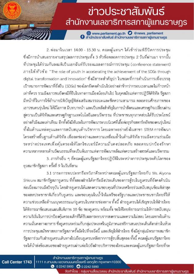 เครดิตภาพและข่าวโดย : ฝ่ายเลขานุการคณะผู้แทนรัฐสภาไทยในการประชุมระดับโลกของยุวสมาชิกรัฐสภา ครั้งที่ 9 กลุ่มงานสหภาพรัฐสภา สำนักองค์การรัฐสภาระหว่างประเทศ