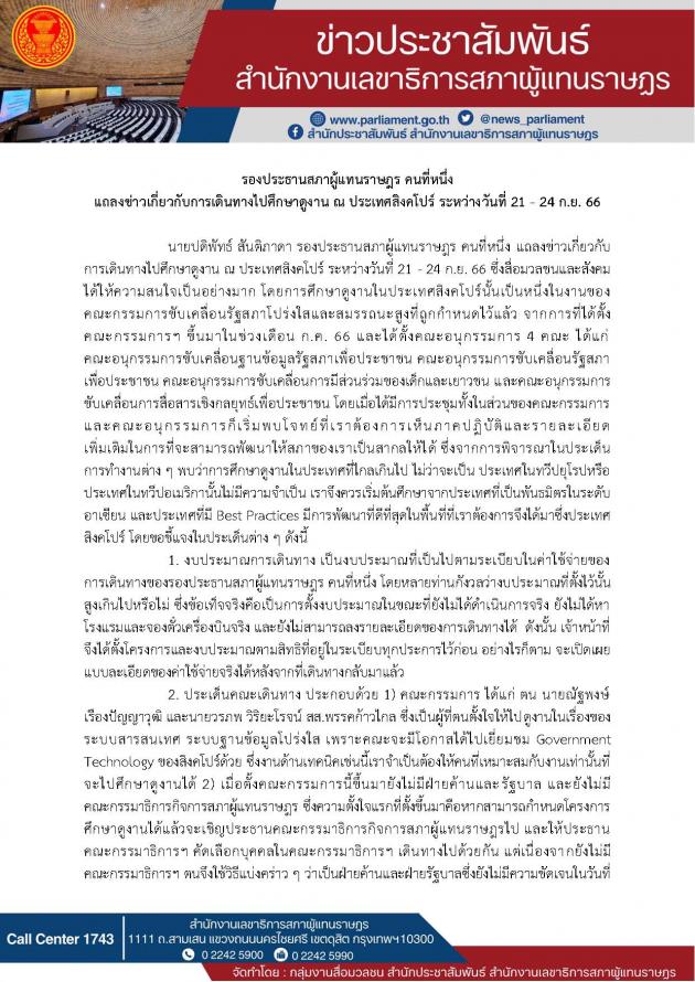 รองประธานสภาผู้แทนราษฎร คนที่หนึ่ง แถลงข่าวเกี่ยวกับการเดินทางไปศึกษาดูงาน ณ ประเทศสิงคโปร์ ระหว่างวันที่ 21 - 24 ก.ย. 66