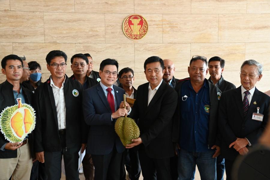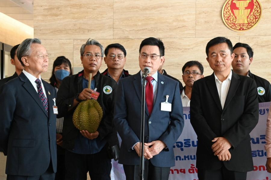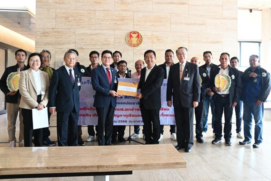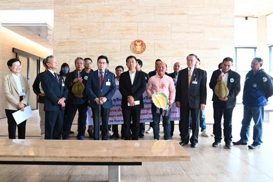 วันพฤหัสบดีที่ 28 กันยายน 2566 เวลา 13.50 นาฬิกา ณ จุดรับยื่นหนังสือ ชั้น 1 (โซนกลาง) อาคารรัฐสภา นายจุรินทร์ ลักษณวิศิษฏ์ พร้อมด้วย นายชวน หลีกภัย และนายบัญญัติ บรรทัดฐาน สส.พรรคประชาธิปัตย์ รับยื่นหนังสือจาก นายบัญญัติ เจตนจันทร์ อดีต สส.พรรคประชาธิปัตย์ และประธานเครือข่ายผลักดันทุเรียนภาคประชาชน พร้อมด้วย นายวสันต์ รื่นรมย์ นายกสมาคมผู้ผลิตทุเรียนไทย คณะกรรมการเครือข่าย ที่ปรึกษาเครือข่าย และเกษตรกรชาวสวนทุเรียน อ.แกลง อ.เขาชะเมา จ.ระยอง เรื่อง ขอให้ช่วยผลักดันให้สภาผู้แทนราษฎรตั้งคณะกรรมาธิการวิสามัญพิจารณาศึกษาการส่งเสริม พัฒนาแก้ไขปัญหาทุเรียนอย่างยั่งยืน ทั้งระบบ และยกร่างกฎหมายว่าด้วยทุเรียน ด้วยปัจจุบันประเทศไทยส่งออกทุเรียนนำรายได้เข้าประเทศเพิ่มขึ้นทุกปี ในปี พ.ศ. 2565 มูลค่าส่งออก 125,800 ล้านบาท เพิ่มขึ้น 5 เท่า เมื่อเทียบกับระยะเวลา 5 ปีที่ผ่านมา โดยจัดเป็นพืชเกษตรส่งออกทำรายได้เข้าประเทศเป็นอันดับสาม รองจากยางพารา และมันสำปะหลัง ทำให้เกษตรกรทั้งภาคตะวันออก ภาคใต้ และภาคอื่น ๆ รวม 43 จังหวัด ขยายพื้นที่ปลูกทุเรียนอย่างรวดเร็ว โดยในปี พ.ศ. 2566 มีพื้นที่ปลูกทุเรียนกว่า 1,340,000 ไร่ ที่ปลูกโดยเกษตรกรรายย่อย และนักลงทุนเป็นเกษตรอุตสาหกรรมเชิงพาณิชย์ การขยายพื้นที่ปลูกทุเรียนต้องใช้ที่ดิน แหล่งน้ำ พลังงานจากน้ำมันและไฟฟ้าเพื่อการเกษตร แรงงานภาคเกษตร การขนส่งผลผลิตทุเรียน อุตสาหกรรมแปรรูปทุเรียน ปุ๋ยเคมี ยาปราบศัตรูพืช รวมทั้งปัจจัยการผลิตอื่น ๆ ในปริมาณที่สูงขึ้น หากไม่มีการบริหารจัดการอย่างเป็นระบบครบวงจร ถ้าผลผลิตทุเรียนล้นตลาด และคุณภาพไม่ได้มาตรฐาน ราคาอาจจะตกต่ำ ตลอดจนหากใช้สารเคมีไม่ถูกต้องอาจจะส่งผลกระทบต่อสิ่งแวดล้อมและสุขภาพ ปัจจุบันภาครัฐมีข้อจำกัดในการบังคับใช้กฎหมายเพื่อควบคุมคุณภาพทุเรียน จึงใช้การขอความร่วมมือการออกระเบียบหรือคำสั่งในระดับจังหวัด ยังไม่มีกฎหมายเกี่ยวกับทุเรียนระดับ พ.ร.บ.มาบังคับใช้โดยเฉพาะ ทำให้มีข้อจำกัดในการลงโทษผู้นำทุเรียนด้อยคุณภาพออกสู่ตลาด หากมีกฎหมายเกี่ยวกับทุเรียนจะทำให้เจ้าหน้าที่ภาครัฐสามารถบังคับใช้กฎหมายเพื่อควบคุมคุณภาพทุเรียนได้อย่างมีประสิทธิภาพ นอกจากนี้ ปัจจุบันภาครัฐยังไม่มีเจ้าภาพหลักดูแลเรื่องทุเรียน แม้ว่าจะมีผู้รับผิดชอบหลายหน่วยงาน แต่ยังขาดการบูรณาการร่วมกันจึงสมควรนำเรื่องทุเรียนมาเป็นวาระแห่งชาติเพื่อให้เกิดความมั่นคงทางเศรษฐกิจ รวมทั้งการไม่มีกองทุนทุเรียนไทย ทำให้เมื่อเกษตรกรชาวสวนทุเรียนกำลังปร