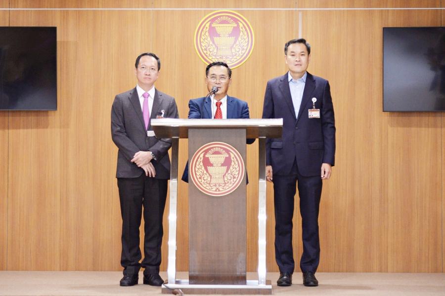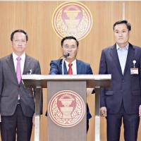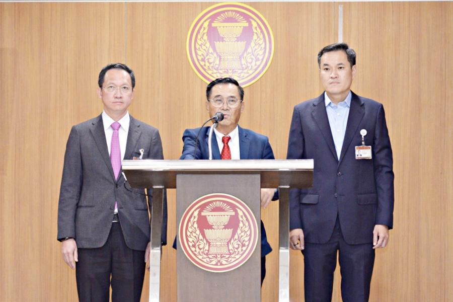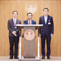 นายอดิศร เพียงเกษ ประธานกรรมการประสานงานสภาผู้แทนราษฎร (วิปรัฐบาล) นายอาสพลธ์ สรรณ์ไตรภพ รองประธานกรรมการ คนที่สี่ และนายอัครเดช วงษ์พิทักษ์โรจน์ กรรมการ ร่วมกันแถลงข่าว ผลการประชุมวิปรัฐบาล