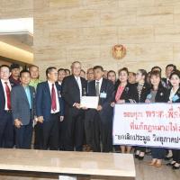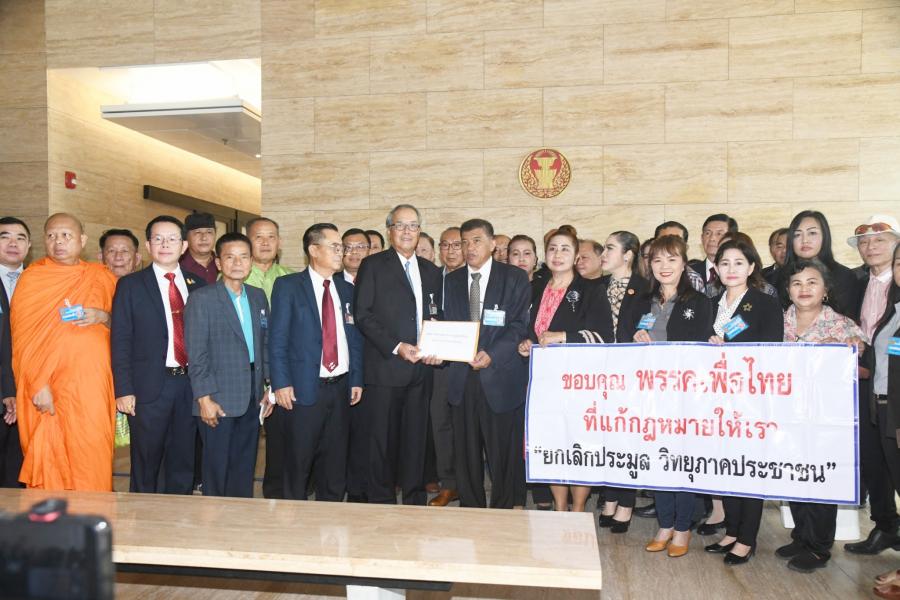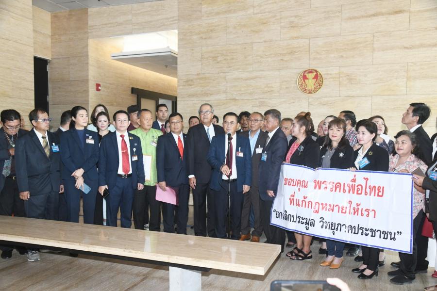 นายชูศักดิ์ ศิรินิล สส.พรรคเพื่อไทย ในฐานะรักษาการหัวหน้าพรรคเพื่อไทย พร้อมด้วย นายอดิศร เพียงเกษ ประธานกรรมการประสานงานสภาผู้แทนราษฎร (วิปรัฐบาล) และ สส.พรรคเพื่อไทย รับยื่นหนังสือจาก นายวรพจน์ ลัภโต ประธานชมรมผู้ประกอบกิจการวิทยุกระจายเสียงภาคประชาชน เพื่อให้ดำเนินการแก้ไขกฎหมาย ยกเลิกการประมูลคลื่นความถี่สำหรับผู้ทดลองออกอากาศ (วิทยุชุมชน) ประเภทธุรกิจ