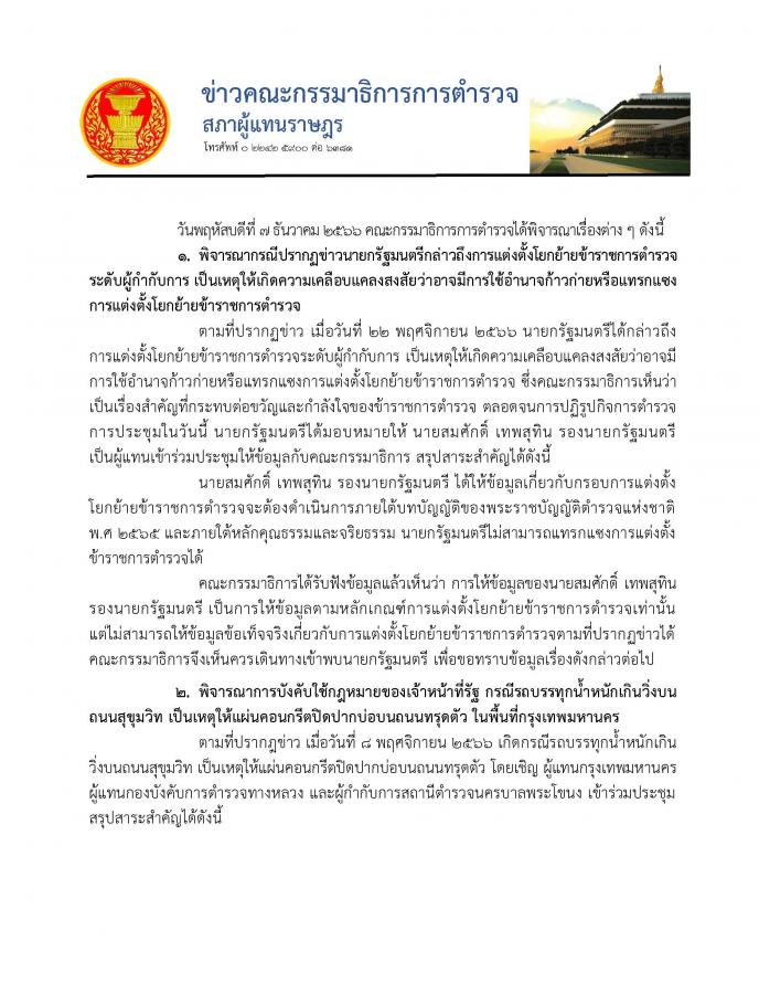วันพฤหัสบดีที่ 7 ธันวาคม 2566 เวลา 15.00 นาฬิกา ณ ห้องแถลงข่าว ชั้น 1 อาคารรัฐสภา นางทิพา ปวีณาเสถียร โฆษกคณะ กมธ.การตำรวจ แถลงข่าวผลการประชุมของคณะ กมธ. ดังนี้ 1. กรณีปรากฏข่าวนายกรัฐมนตรีกล่าวถึงการแต่งตั้งโยกย้ายข้าราชการตำรวจระดับผู้กำกับการ เป็นเหตุให้เกิดความเคลือบแคลงสงสัยว่าอาจมีการใช้อำนาจก้าวก่ายหรือแทรกแซงการแต่งตั้งโยกย้ายข้าราชการตำรวจ โดยนายกรัฐมนตรีได้มอบหมายให้ นายสมศักดิ์ เทพสุทิน รองนายกรัฐมนตรี เป็นผู้แทนเข้าร่วมประชุมและให้ข้อมูลต่อคณะ กมธ. เกี่ยวกับกรอบการแต่งตั้งโยกย้ายข้าราชการตำรวจจะต้องดำเนินการภายใต้บทบัญญัติของ พ.ร.บ.ตำรวจแห่งชาติ พ.ศ. 2565 และภายใต้หลักคุณธรรมและจริยธรรม นายกรัฐมนตรีไม่สามารถแทรกแซงการแต่งตั้งข้าราชการตำรวจได้ อย่างไรก็ตาม คณะ กมธ.ได้รับฟังข้อมูลแล้วเห็นว่า การให้ข้อมูลดังกล่าวเป็นไปตามหลักเกณฑ์การแต่งตั้งโยกย้ายข้าราชการตำรวจเท่านั้น แต่ไม่สามารถให้ข้อมูลข้อเท็จจริงตามที่ปรากฏข่าวได้ จึงเห็นควรเดินทางเข้าพบนายกรัฐมนตรี เพื่อขอทราบข้อมูลดังกล่าวต่อไป