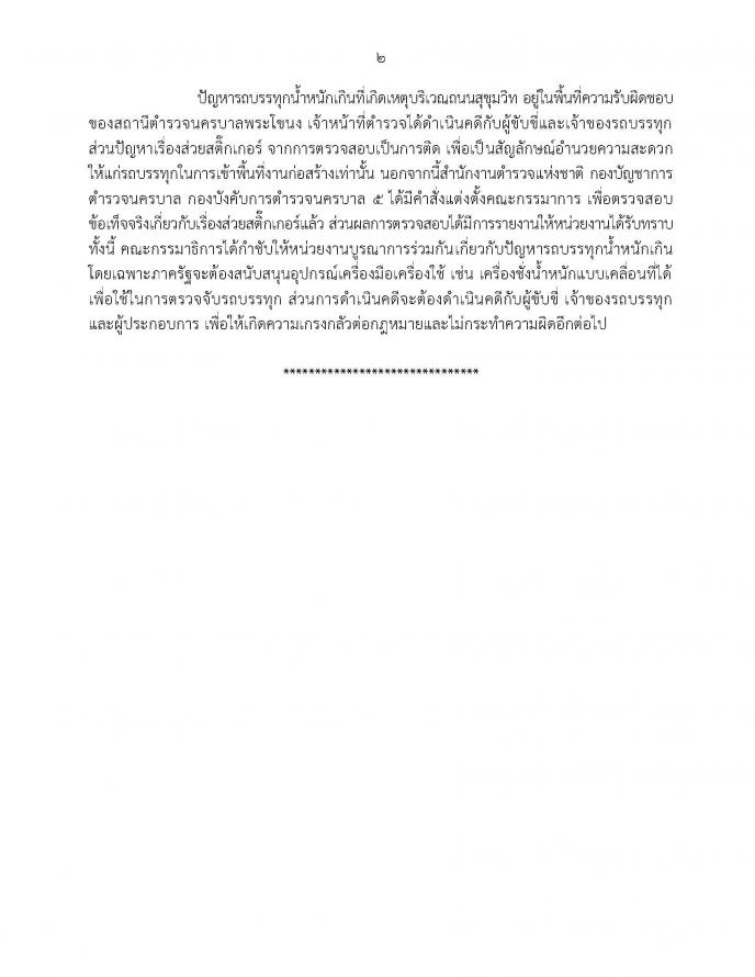 2. การบังคับใช้กฎหมายของเจ้าหน้าที่รัฐ กรณีรถบรรทุกน้ำหนักเกินวิ่งบนถนนสุขุมวิท เป็นเหตุให้แผ่นคอนกรีตปิดปากบ่อบนถนนทรุดตัว ในพื้นที่กรุงเทพมหานคร โดยเชิญผู้แทนกรุงเทพมหานคร กองบังคับการตำรวจทางหลวง และผู้กำกับการสถานีตำรวจนครบาลพระโขนง เข้าร่วมประชุม ทั้งนี้ คณะ กมธ.ได้กำชับให้หน่วยงานที่เกี่ยวข้องบูรณาการร่วมกันแก้ไขปัญหารถบรรทุกน้ำหนักเกิน โดยเฉพาะภาครัฐจะต้องสนับสนุนอุปกรณ์ เช่น เครื่องชั่งน้ำหนักแบบเคลื่อนที่ได้ เพื่อใช้ในการตรวจจับรถบรรทุก ส่วนการดำเนินคดีจะต้องดำเนินคดีกับผู้ขับขี่ เจ้าของรถบรรทุก และผู้ประกอบการ เพื่อให้เกิดความเกรงกลัวต่อกฎหมายและไม่กระทำความผิดอีกต่อไป |