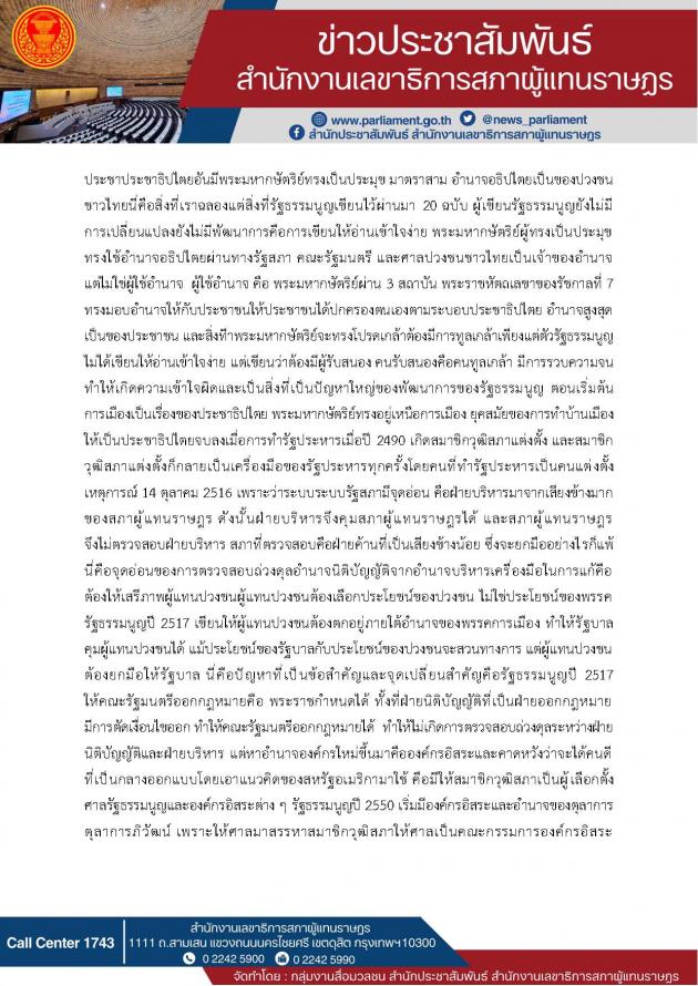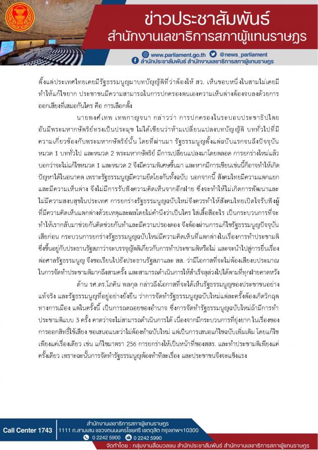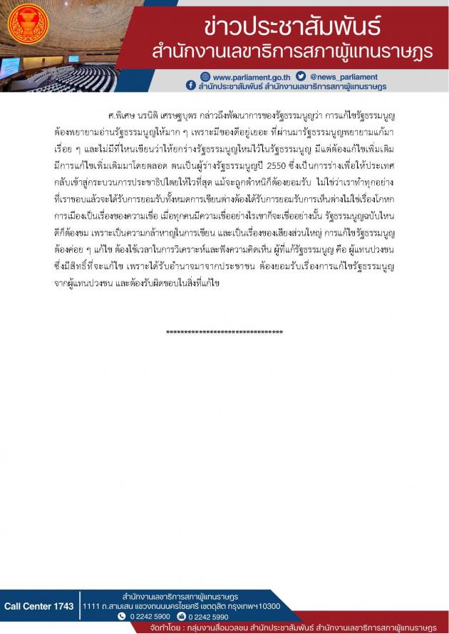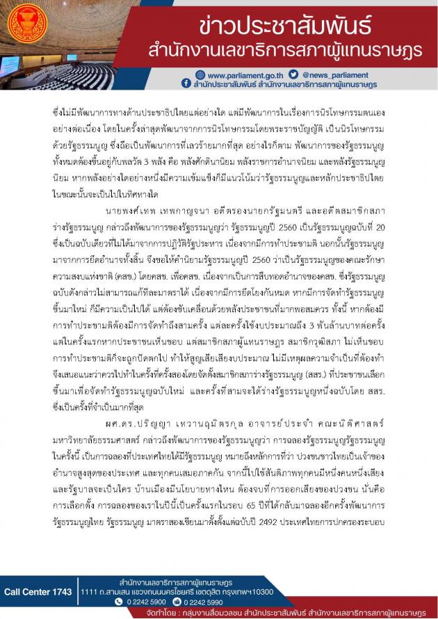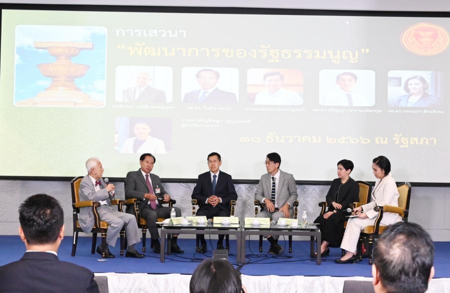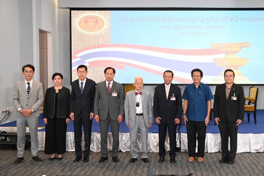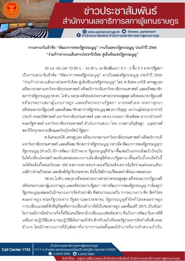 | วันอาทิตย์ที่ 10 ธันวาคม 2566 เวลา 15.00 - 16.30 นาฬิกา ณ ห้องประชุมสัมมนา B1 - 2 ชั้น B1 อาคารรัฐสภา เป็นการเสวนาในหัวข้อ พัฒนาการของรัฐธรรมนูญ งานวันฉลองรัฐธรรมนูญ ประจำปี 2566 ร่วมก้าวย่างบนเส้นทางประชาธิปไตย สู่เส้นชัยแห่งรัฐธรรมนูญ โดย ศ.พิเศษนรนิติ เศรษฐบุตร อดีตนายกสภามหาวิทยาลัยธรรมศาสตร์ อดีตอธิการบดีมหาวิทยาลัยธรรมศาสตร์ และอดีตสมาชิกสภาร่างรัฐธรรมนูญ รศ.ดร. โภคิน พลกุล อดีตรองประธานศาลปกครองสูงสุด อดีตรองนายกรัฐมนตรี อดีตประธานสภาผู้แทนราษฎร และอดีตประธานรัฐสภา นายพงศ์เทพ เทพกาญจนา อดีตรองนายกรัฐมนตรี และอดีตสมาชิกสภาร่างรัฐธรรมนูญ |