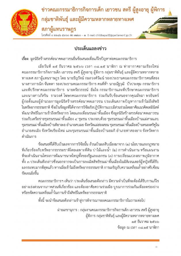 | วันศุกร์ที่ 15 ธันวาคม 2566 เวลา 08.15 นาฬิกา ณ ท่าอากาศยาน เชียงใหม่ จ.เชียงใหม่ คณะ กมธ.กิจการเด็ก เยาวชน สตรี ผู้สูงอายุ ผู้พิการ กลุ่มชาติพันธุ์ และผู้มีความหลากหลายทางเพศ โดย นายธัญวัจน์ กมลวงศ์วัฒน์ รองประธานคณะ กมธ. คนที่สอง น.ส.การณิก จันทดา รองประธานคณะ กมธ. คนที่ห้า นายณัฐวุฒิ บัวประทุม และนายตรัยวรรธน์ อิ่มใจ กมธ. และที่ปรึกษาคณะ กมธ. พร้อมด้วย น.ส.ภัสริน รามวงศ์ โฆษกคณะ กมธ. ร่วมกันรับยื่นข้อเสนอจาก น.ส.มัจฉา พรอินทร์ ผู้ก่อตั้งและผู้อำนวยการมูลนิธิสร้างสรรค์อนาคตเยาวชน และคณะ ในประเด็นสภาพปัญหาการเข้าไม่ถึงสิทธิในทรัพยากรธรรมชาติ ซึ่งข้อเสนอดังกล่าวมาจากนโยบายและกฎหมายที่เกี่ยวข้องกับทรัพยากรธรรมชาติโดยเฉพาะที่ดิน ป่าไม้และน้ำ การดำเนินงาน หรือแผนงานที่จะดำเนินงานโครงการพัฒนาขนาดใหญ่ ทั้งของรัฐและเอกชน และการเปลี่ยนแปลงสภาพภูมิอากาศ โดยคณะ กมธ. จะนำข้อเสนอดังกล่าวเข้าสู่การพิจารณาของคณะ กมธ. ต่อไป |