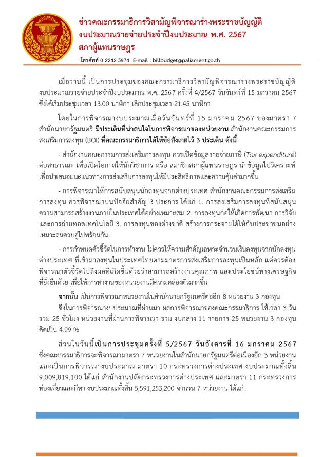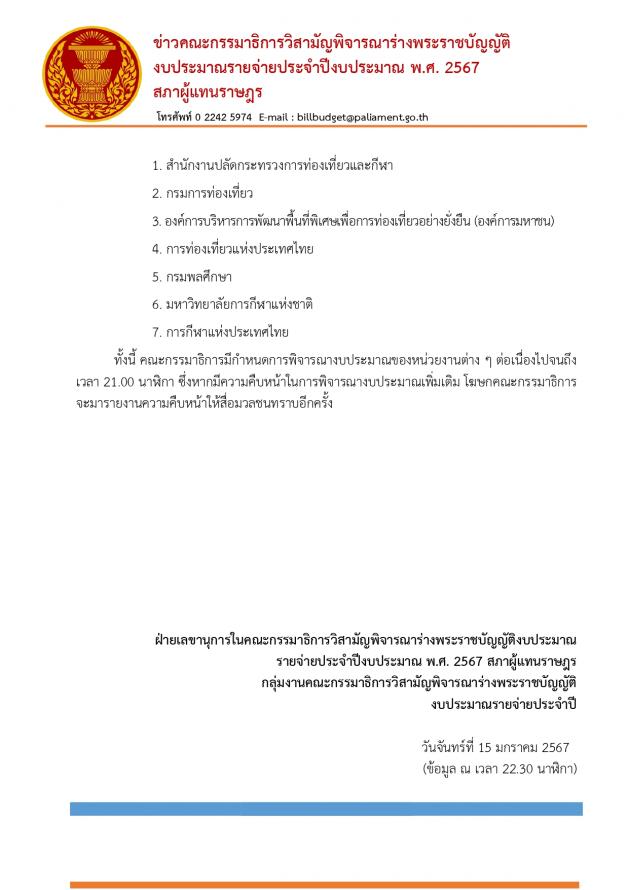 | วันอังคารที่ 16 มกราคม 2567 เวลา 13.30 นาฬิกา ณ ห้องแถลงข่าว ชั้น 1 อาคารรัฐสภา นายยูนัยดี วาบา และนางธิวัลรัตน์ อังกินันทน์ โฆษกคณะ กมธ. วิสามัญพิจารณาร่างพระราชบัญญัติงบประมาณรายจ่ายประจำปีงบประมาณ พ.ศ. 2567 แถลงผลการประชุมคณะกมธ. เมื่อวันที่ 15 ม.ค. 67 ซึ่งที่ประชุมมีการพิจารณามาตรา 7 ของสำนักนายกรัฐมนตรี ส่วนในวันนี้ (16 ม.ค. 67) มีการพิจารณามาตรา 7 ต่อเนื่องอีก 3 หน่วยงาน และพิจารณามาตรา 10 ของกระทรวงการต่างประเทศ และมาตรา 11 ของกระทรวงการท่องเที่ยวและกีฬา ทั้งนี้ คณะ กมธ.จะมีการพิจารณาต่อเนื่องไปจนถึงเวลา 21.00 น. |