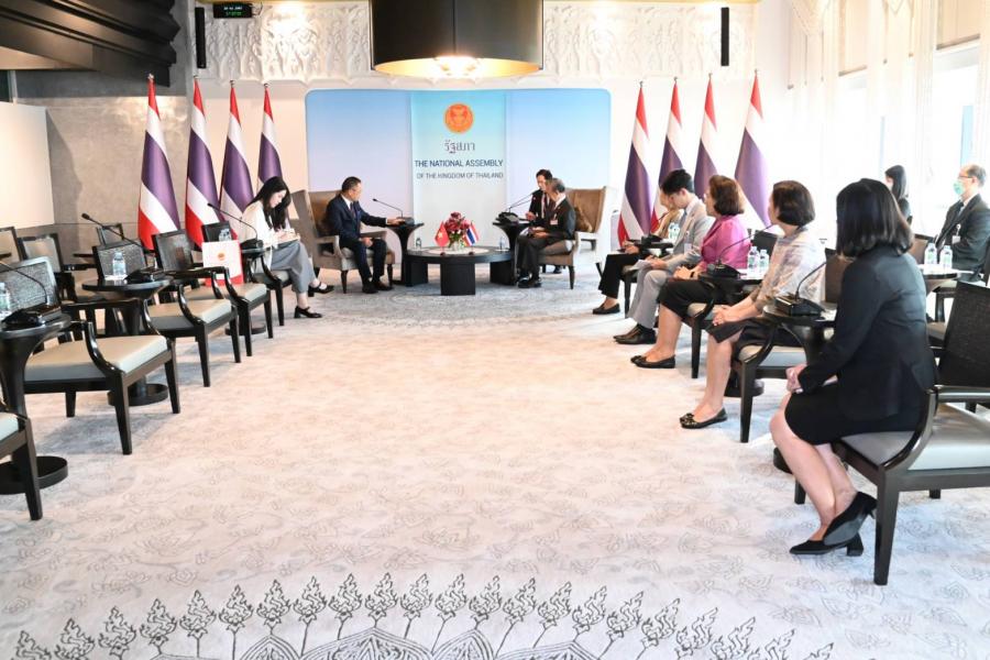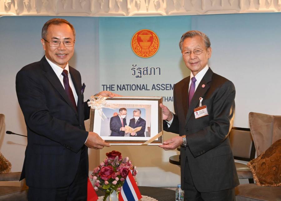 นายชวน หลีกภัย สมาชิกสภาผู้แทนราษฎร และอดีตประธานรัฐสภาและประธานสภาผู้แทนราษฎรกล่าวต้อนรับด้วยความยินดี และกล่าวชื่นชมเวียดนามที่มีความเจริญเติบโตในทุกด้าน สำหรับการเดินทางไปเยือนเวียดนามนั้น เดิมมีความตั้งใจจะเดินทางไปเยือนเวียดนาม แต่ในระหว่างที่ตนดำรงตำแหน่งประธานรัฐสภา ได้เกิดสถานการณ์การแพร่ระบาดของโรคโควิด 19 พร้อมกล่าวถึงต้นซากือที่นำมาจากเวียดนามมาปลูกที่ประเทศไทยจะเป็นสิ่งที่เชื่อมความสัมพันธ์ระหว่างไทย-เวียดนามตลอดไป และได้ฝากความปรารถนาดีไปยังนายเหงียน ซวนฟุก อดีตประธานาธิบดีเวียดนาม นางเหงียน ถิ กิม เงิน อดีตประธานสภาแห่งชาติเวียดนาม นายหวอ วัน เถือง ประธานาธิบดีเวียดนาม และนายเวือง ดิ่งห์ เหวะ ประธานสภาแห่งชาติเวียดนามด้วย