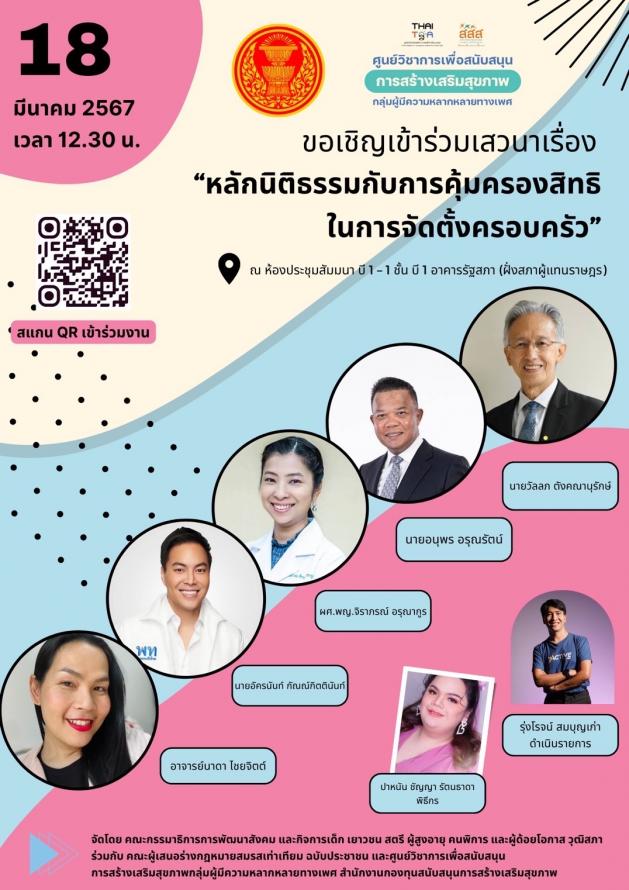 วันพฤหัสบดีที่ 14 มีนาคม 2567 เวลา 15.00 นาฬิกา ณ ห้องแถลงข่าว ชั้น 1 อาคารรัฐสภา นายอัครนันท์ กัณณ์กิตตินันท์ รองประธานคณะ กมธ.วิสามัญพิจารณาร่าง พ.ร.บ.แก้ไขเพิ่มเติมประมวลกฎหมายแพ่งและพาณิชย์ (ฉบับที่ ..) พ.ศ. .... คนที่หนึ่ง พร้อมคณะ แถลงข่าวความคืบหน้าการพิจารณาร่าง พ.ร.บ.แก้ไขเพิ่มเติมประมวลกฎหมายแพ่งและพาณิชย์ (ฉบับที่ ..) พ.ศ. .... หรือร่าง พ.ร.บ.สมรสเท่าเทียมว่า วันนี้คณะ กมธ. มีมติรับหลักการร่าง พ.ร.บ. ดังกล่าว และจะนำเข้าสู่การพิจารณาของสภาฯ ในวาระที่ 2 และ 3 ในวันที่ 27 มี.ค. 67 ถือเป็นนิมิตหมายที่ดีที่ พ.ร.บ. จะผ่านและเข้าไปอยู่ในชั้นของสภา นี่เป็นสิ่งที่พวกเราทุกคนในฐานะตัวแทนของคณะกมธ. ทำงานร่วมกันมาจนวันนี้พิจารณาสำเร็จ ถือเป็นความสำเร็จของทุกคน และพี่น้องประชาชนจะได้ใช้กฎหมายฉบับนี้ ขอแสดงความยินดีกับพี่น้องประชาชนทุกคน และเชื่อว่าสภาฯ จะให้ความเห็นชอบ ในนามคณะกมธ. ขอขอบคุณประชาชน กมธ. และผู้ที่มีส่วนเกี่ยวข้องทุกท่าน เพราะกฎหมายฉบับนี้กำลังจะเปลี่ยนบริบทสังคมครั้งใหญ่ เป็นสิ่งที่หลายคนรอคอย และจะสำเร็จในปีนี้ ถือเป็นความสำเร็จร่วมกันของทุกคน ขอความเท่าเทียมจงเกิดขึ้นในประเทศไทย สำหรับสาระสำคัญของกฎหมายฉบับนี้ คือ บุคคลที่มีอายุ 18 ปีบริบูรณ์ขึ้นไป ไม่ว่าจะเป็นเพศใดก็ตามสามารถหมั้นและสมรสกันได้ มีสิทธิในสวัสดิการตามที่สามีหรือภรรยาได้สิทธิตามบทบัญญัติในกฎหมายอื่นตามการแก้ไขประมวลกฎหมายแพ่งและพาณิชย์ฉบับนี้ ภายใน 120 วันหลังการประกาศใช้ และสามารถรับบุตรบุญธรรมได้ แต่การขอสัญชาติ การตั้งครรภ์ทางเทคโนโลยี จะมีการพิจารณาเพื่อขับเคลื่อนกันต่อไป