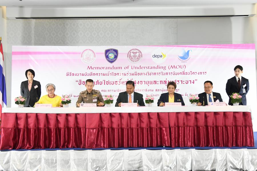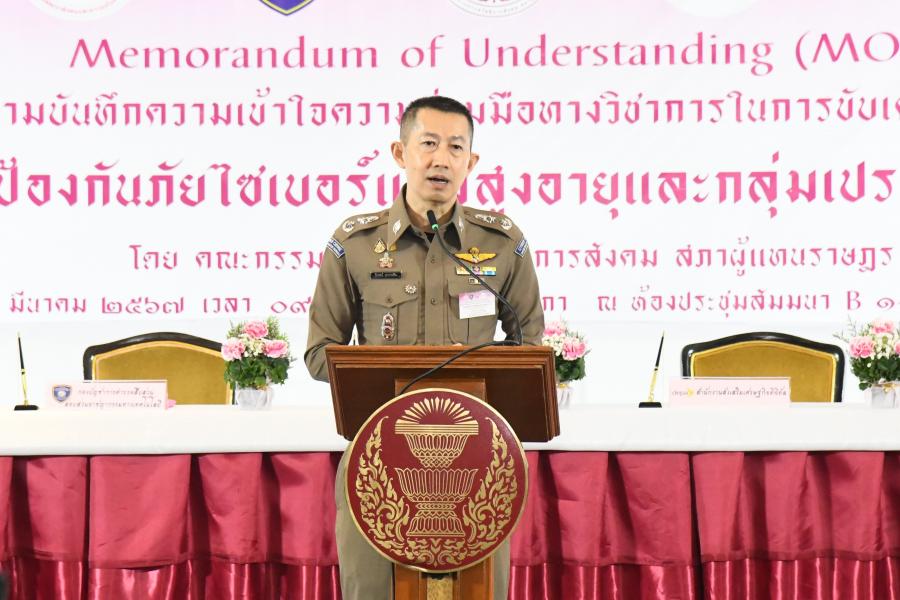 ทั้งนี้ ก่อนลงนามบันทึกความเข้าใจ (MOU) ได้มีการบรรยายพิเศษ เรื่อง สถิติและสถานการณ์ของผู้สูงอายุที่ได้รับความเสียหายจากภัยไซเบอร์ โดย พล.ต.ต.ชัชปัณฑกาณฑ์ คล้ายคลึง ผู้บังคับการกองบังคับการตำรวจสืบสวนสอบสวนอาชญากรรมทางเทคโนโลยี 1 สำหรับการลงนามบันทึกความเข้าใจ (MOU) ดังกล่าว เป็นการลงนามระหว่างคณะ กมธ.การสวัสดิการสังคม กับ 4 หน่วยงาน ประกอบด้วย 1. กรมกิจการผู้สูงอายุ กระทรวงการพัฒนาสังคมและความมั่นคงของมนุษย์ 2. สำนักงานส่งเสริมเศรษฐกิจดิจิทัล กระทรวงดิจิทัลเพื่อเศรษฐกิจและสังคม 3. กองบัญชาการตำรวจสืบสวนสอบสวนอาชญากรรมทางเทคโนโลยี และ 4. กองทุนพัฒนาสื่อปลอดภัยและสร้างสรรค์