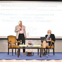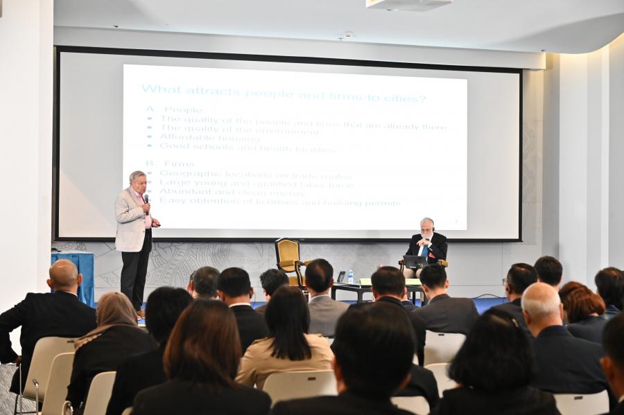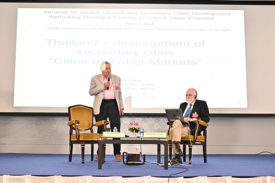 จากนั้น เป็นการสัมมนาในหัวข้อ "ยุทธศาสตร์การสร้างความเจริญเติบโตทางเศรษฐกิจเชิงพื้นที่และการพัฒนาเมืองเพื่อเพิ่มผลิตภาพและลดความเหลื่อมล้ำ" โดยได้รับเกียรติจาก Mr.Alain Bertaud และ Mr.Matthew Glasser ที่ปรึกษาธนาคารโลก ร่วมเป็นวิทยากร