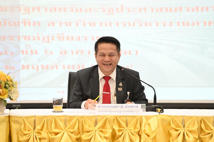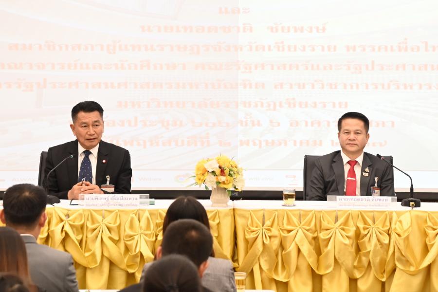 วันพฤหัสบดีที่ 2 พฤษภาคม 2567 เวลา 13.30 นาฬิกา ณ ห้องประชุม 606 ชั้น 6 อาคารรัฐสภา นายพิเชษฐ์ เชื้อเมืองพาน รองประธานสภาผู้แทนราษฎร คนที่สอง ให้การต้อนรับและให้เกียรติบรรยายพิเศษในหัวข้อ "รัฐสภาไทยกับประชาชนในพื้นที่ ให้กับคณาจารย์ และนักศึกษา คณะรัฐศาสตร์และรัฐประศาสนศาสตร์ หลักสูตรรัฐประศาสนศาสตรมหาบัณฑิต สาขาวิชาการบริหารงานภาครัฐ มหาวิทยาลัยราชภัฏเชียงราย จำนวน 22 คน เนื่องในโอกาสเดินทางมาศึกษาดูงาน และเยี่ยมชมภูมิทัศน์และสถาปัตยกรรมต่าง ๆ บริเวณโดยรอบอาคารรัฐสภา โดยมี นายเทอดชาติ ชัยพงษ์ สส.จังหวัดเชียงราย พรรคเพื่อไทย น.ส.พิชชา เชื้อเมืองพาน ผู้ช่วยเลขานุการรองประธานสภาผู้แทนราษฎร คนที่สอง ร่วมให้การต้อนรับ