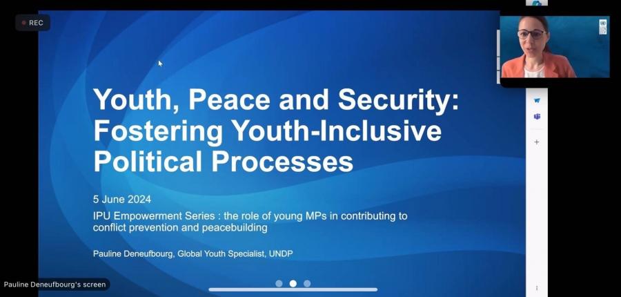 เมื่อวันที่ 5 มิ.ย. 67 เวลา 18.00 - 20.00 น. ตามเวลาประเทศไทย ยุวสมาชิกรัฐสภาไทย (สมาชิกรัฐสภาอายุต่ำกว่า 45 ปี) รวม 4 คน ประกอบด้วย นายเท่าพิภพ  ลิ้มจิตรกร นายชัยวัฒน์ สถาวรวิจิตร น.ส.ศนิวาร บัวบาน และน.ส.พิมพ์กาญจน์ กีรติวิราปกรณ์ สมาชิกสภาผู้แทนราษฎร เข้าร่วมกิจกรรมการบรรยายสรุปออนไลน์ ครั้งที่ 10 ภายใต้โครงการชุดออนไลน์ของสหภาพรัฐสภาเพื่อเสริมสร้างพลังของยุวสมาชิกรัฐสภา (IPU's Empowerment Series for Young Parliamentarians) ซึ่งจัดขึ้นผ่านแอปพลิเคชันซูม (Zoom) ในหัวข้อ "บทบาทของยุวสมาชิกรัฐสภาในการป้องกันความขัดแย้งและการสร้างสันติภาพ" (The role of young MPs in Contributing to conflict prevention and peacebuilding) โดยมี Ms. Emma Muteka สมาชิกรัฐสภานามิเบีย ในฐานะกรรมการบริหารการประชุมยุวสมาชิกรัฐสภาของสหภาพรัฐสภา (Member of the Board of the IPU Forum of Young Parliamentarians) ทำหน้าที่ผู้ดำเนินรายการ และมียุวสมาชิกรัฐสภาและเจ้าหน้าที่รัฐสภารวมกว่า 70 คน จากประเทศสมาชิก IPU ทั่วโลกเข้าร่วมกิจกรรมครั้งนี้