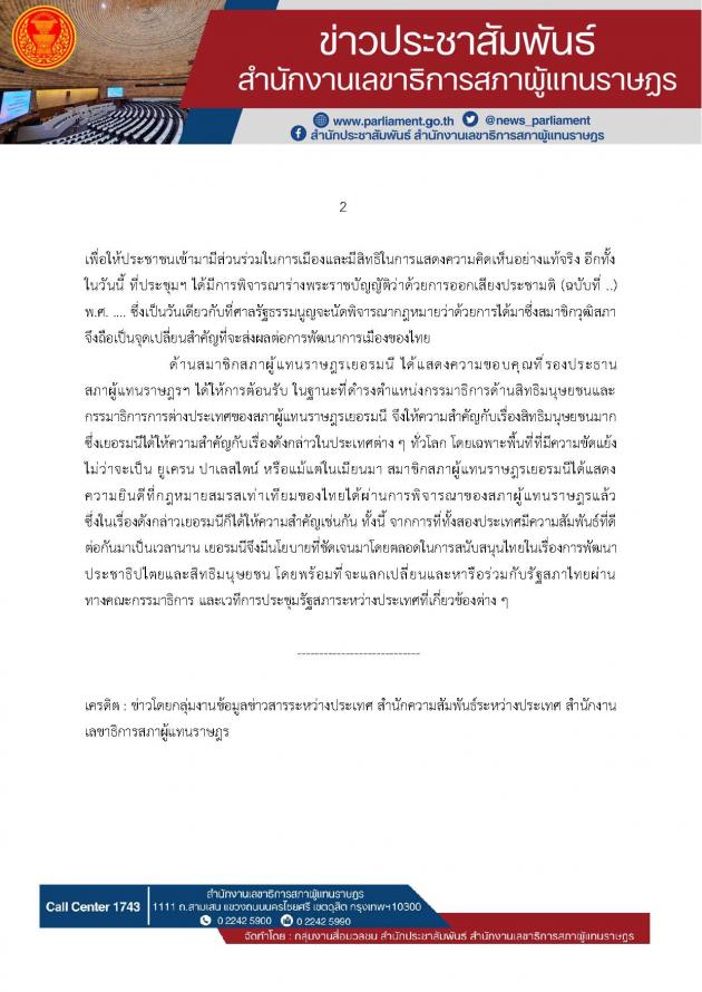 วันอังคารที่ 18 มิถุนายน 2567 เวลา 09.30 นาฬิกา ณ ห้องรับรองพิเศษ 205 ชั้น 2 อาคารรัฐสภา นายปดิพัทธ์ สันติภาดา รองประธานสภาผู้แทนราษฎร คนที่หนึ่ง ให้การรับรอง นางเรนาตา อัลท์ สมาชิกสภาผู้แทนราษฎรสหพันธ์สาธารณรัฐเยอรมนี ในโอกาสเดินทางเยือนประเทศไทย พร้อมกระชับความสัมพันธ์อันดีระหว่างรัฐสภาไทยกับรัฐสภาเยอรมนี โดยมี น.ส.ชนนิกานต์ วชิโรปถัมป์ นักวิชาการคณะทำงานทางการเมือง ของรองประธานสภาผู้แทนราษฎร คนที่หนึ่ง ร่วมให้การรับรอง(รายละเอียดตามเอกสารที่แนบ) |