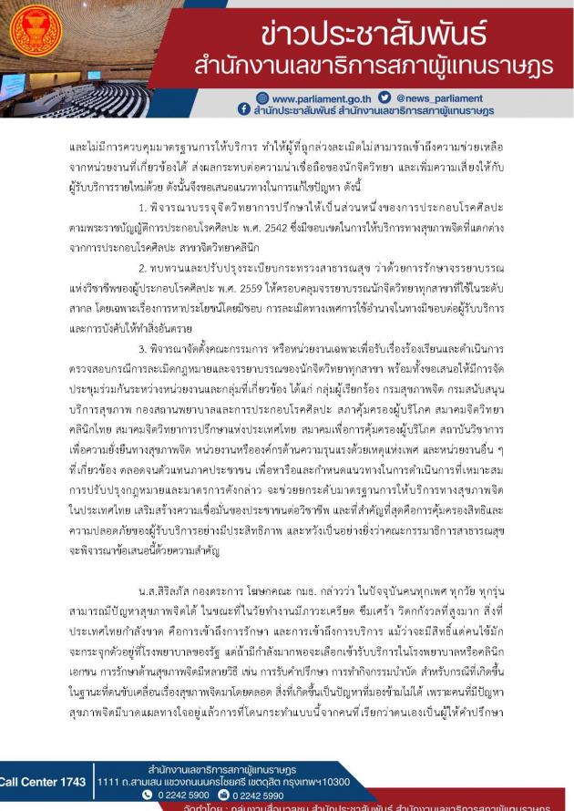 สภาคุ้มครองผู้บริโภค สมาคมจิตวิทยาคลินิกไทย สมาคมจิตวิทยาการปรึกษาแห่งประเทศไทยสมาคมเพื่อการคุ้มครองผู้บริโภค สถาบันวิชาการเพื่อความยั่งยืนทางสุขภาพจิต หน่วยงานหรือองค์กรด้านความรุนแรงด้วยเหตุแห่งเพศ และหน่วยงานอื่น ๆ ที่เกี่ยวข้อง ตลอดจนตัวแทนภาคประชาชน เพื่อหารือและกำหนดแนวทางในการดำเนินการที่เหมาะสมการปรับปรุงก ฎหมายและมาตรการดังกล่าวจะช่วยยกระดับมาตรฐานการให้บริการทางสุขภาพจิตในประเทศไทย เสริมสร้างความเชื่อมั่นของประชาชนต่อวิชาชีพ และที่สำคัญที่สุดคือการคุ้มครองสิทธิและความปลอดภัยของผู้รับบริการอย่างมีประสิทธิภาพข้าพเจ้าหวังเป็นอย่างยิ่งว่าคณะกรรมาธิกรสาธารณสุขจะพิจารณาข้อเสนอนี้ด้วยความสำคัญ