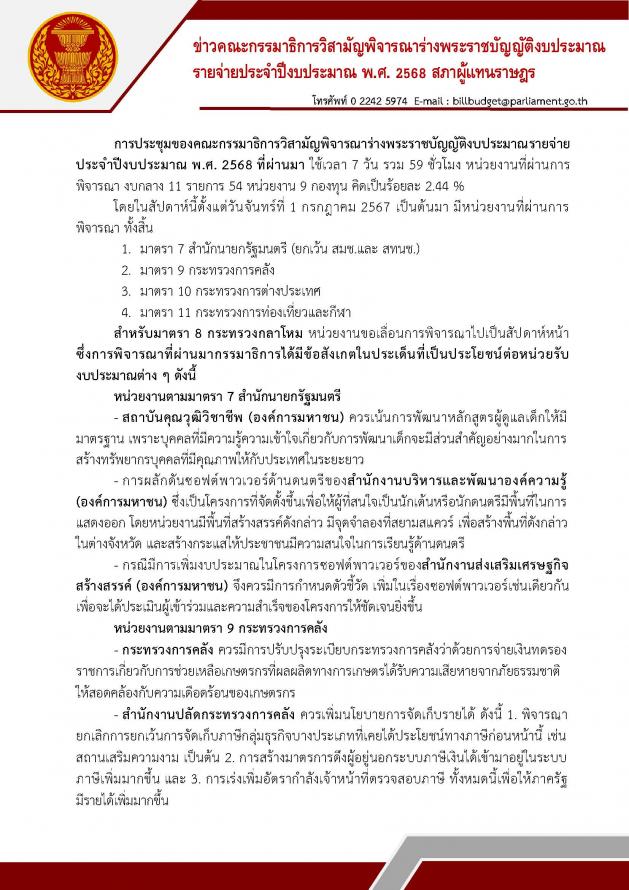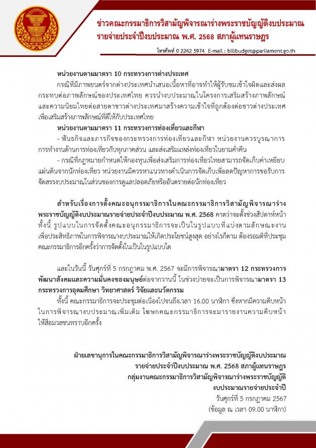 สำหรับในวันนี้ (5 ก.ค. 67) จะมีการพิจารณามาตรา 12 กระทรวงการพัฒนาสังคมและความมั่นคงของมนุษย์ต่อจากวานนี้ ในช่วงบ่ายจะเป็นการพิจารณามาตรา 13 กระทรวงการอุดมศึกษา วิทยาศาสตร์ วิจัยและนวัตกรรม ทั้งนี้คณะ กมธ. จะแถลงข่าวสัปดาห์ละ 2 ครั้งคือ ทุกวันอังคารและวันพฤหัสบดี เวลา 11.00 น.