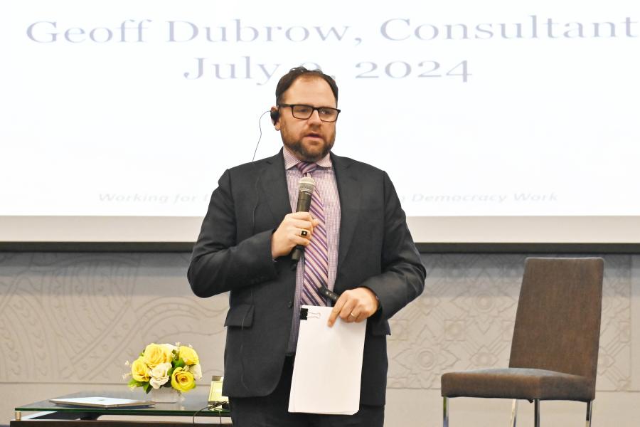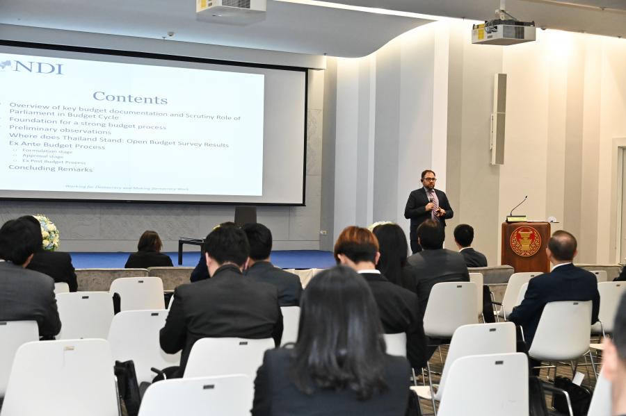 จากนั้น เป็นการสัมมนา เรื่อง ยกเครื่องระบบงบประมาณไทย : มุมมอง ข้อสังเกต และข้อเสนอแนะ จากการปฏิรูประบบงบประมาณในต่างประเทศ โดยมี Mr. Geoff Dubrow ผู้ก่อตั้งและที่ปรึกษาหลักของ Nexus PFM Consulting เป็นวิทยากร ซึ่งได้กล่าวใจความตอนหนึ่งว่า รู้สึกยินดีเป็นอย่างยิ่งที่ได้ทำงานร่วมกับคณะ กมธ.ศึกษาการจัดทำและติดตามการบริหารงบประมาณ ซึ่งเป็นพันธมิตรที่ดี สถาบันส่งเสริมประชาธิปไตย เป็นองค์กรที่ทำงานเกี่ยวข้องกับประเทศต่าง ๆ ทั่วโลกโดยตั้งใจที่จะเพิ่มความเข้มแข็งของระบอบประชาธิปไตย หลักธรรมาภิบาล และการมีส่วนร่วมของประชาชนในกระบวนการตัดสินใจ ความโปร่งใส และความรับผิดชอบเพื่อให้ตอบสนองต่อความต้องการของประชาชนให้มากขึ้น